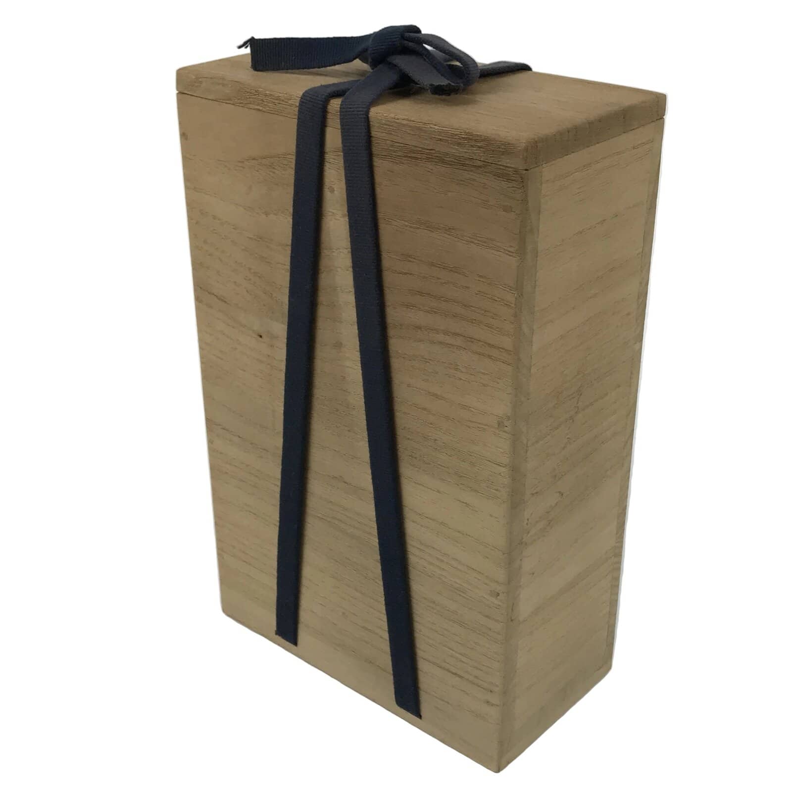This lidded wooden box is made for a pair of sake bottles, choshi. The inside is separated into two compartments. It has a navy blue cord that ties it all together. It is made from strong wood and is excellent for general storage, DIY, or decoration.