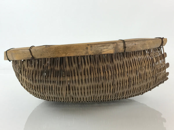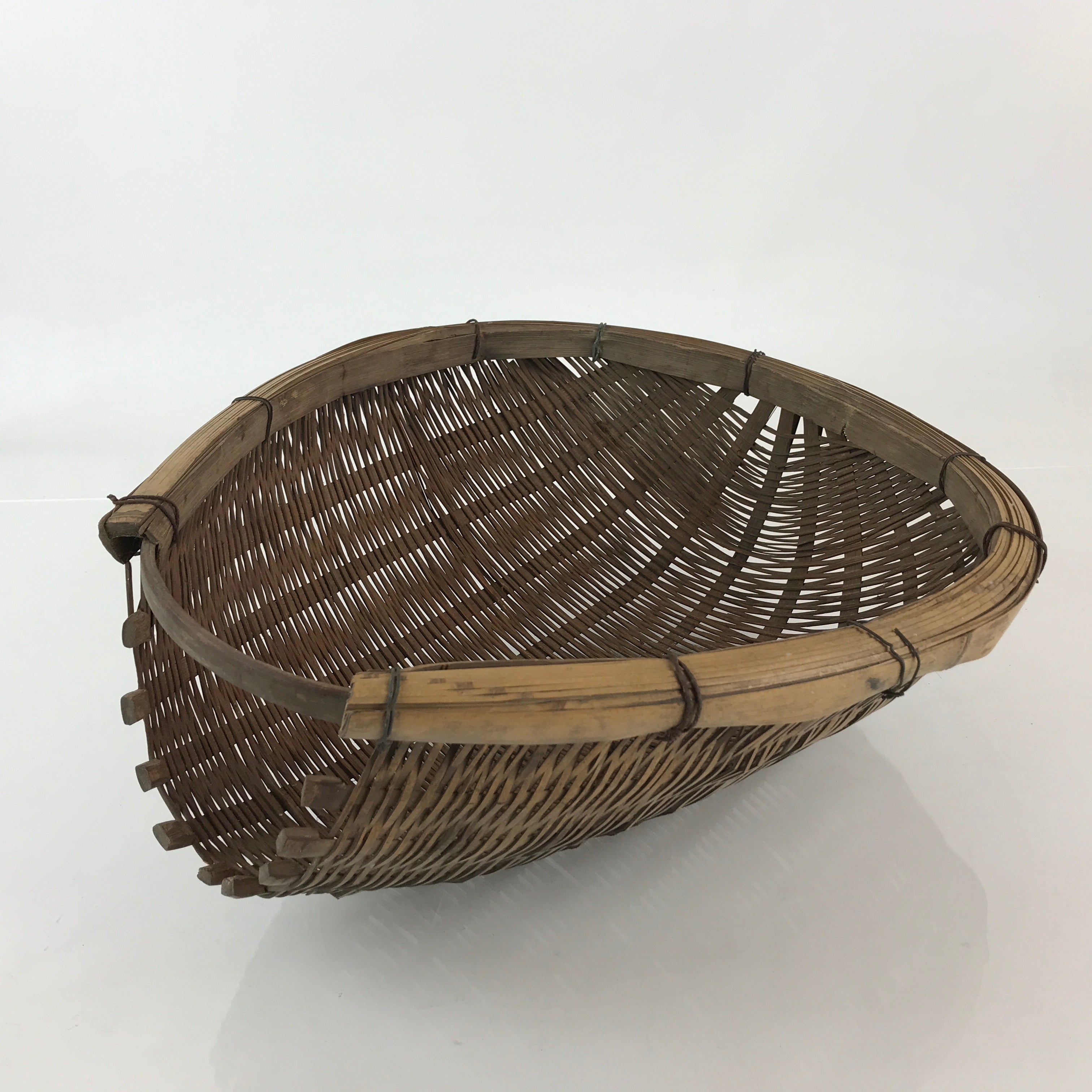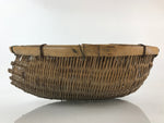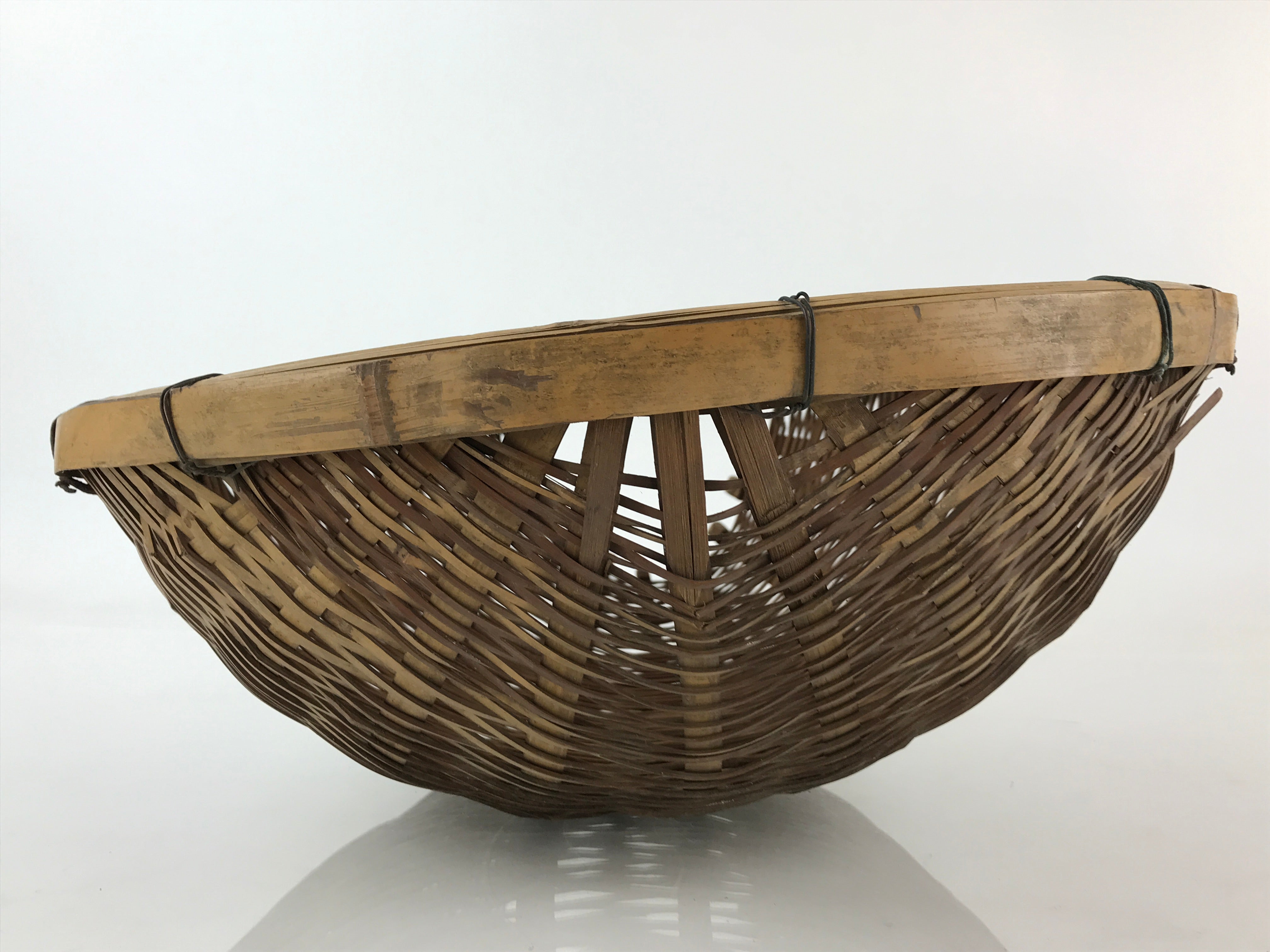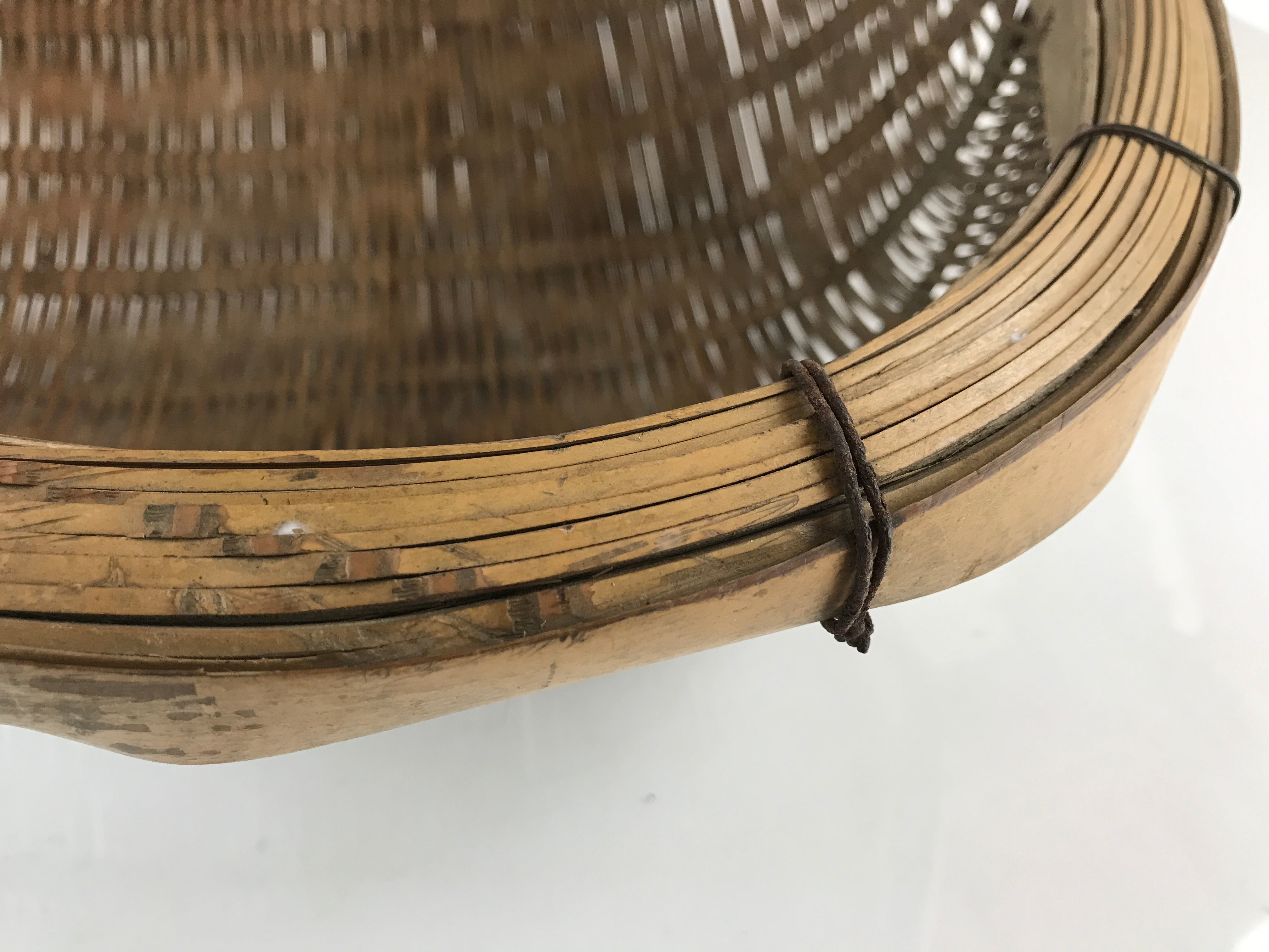 This is a traditional natural bamboo woven basket used for drying or draining water from various items such as tea leaves, small vegetables like edamame pods, etc. This particular type of handwoven zaru has one open side, giving it the name Kataguchi-zaru and is bound together by metal wire.