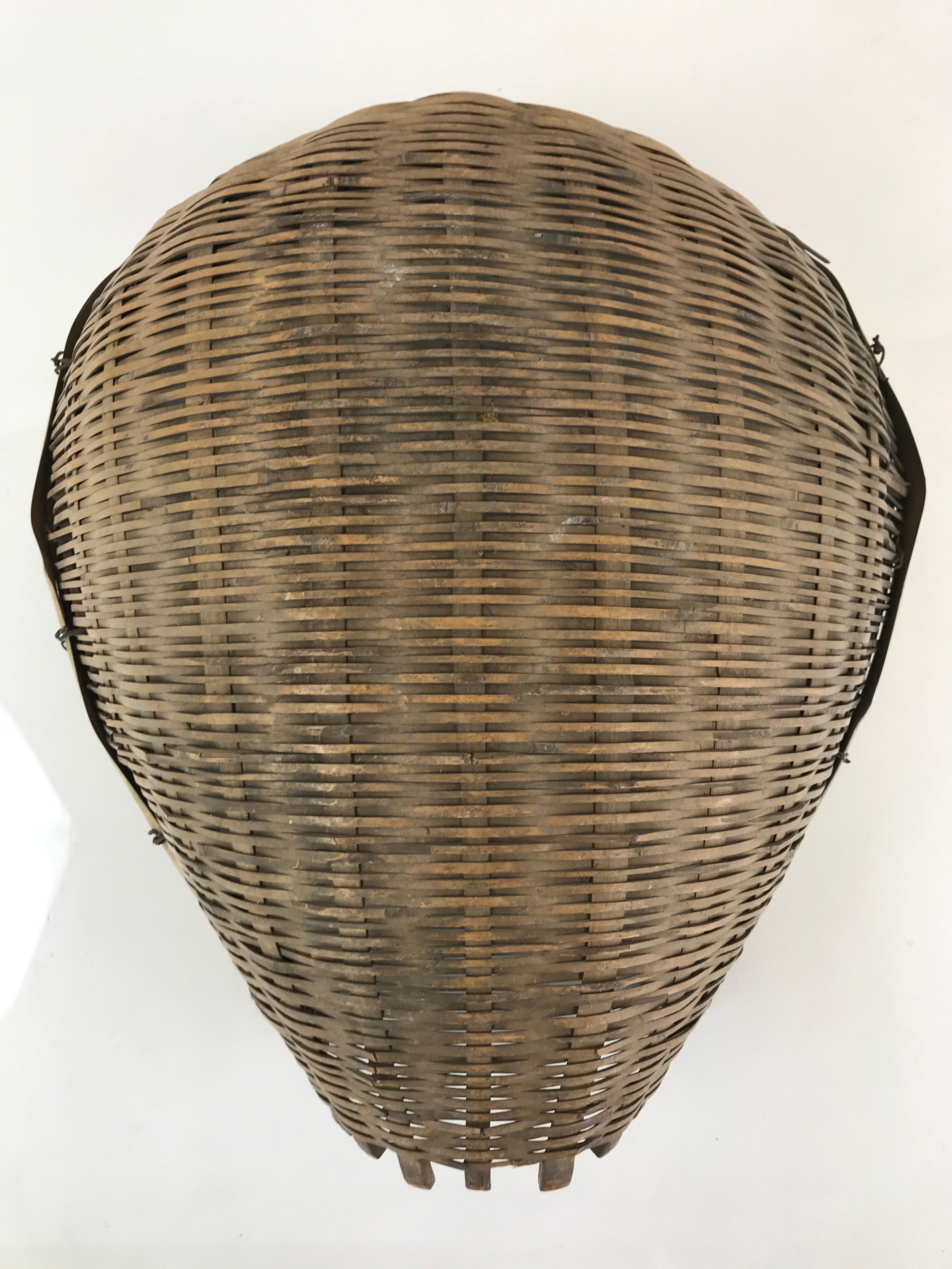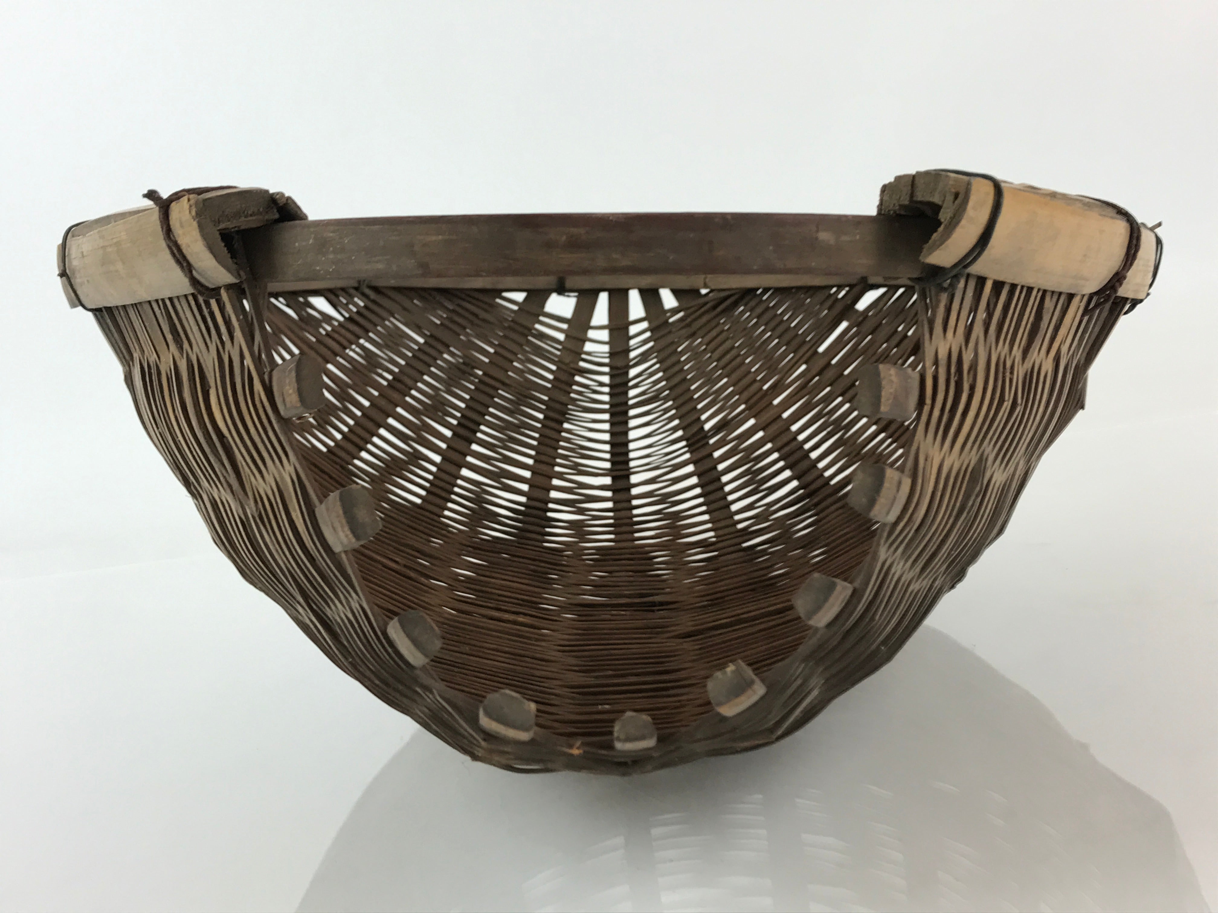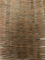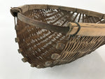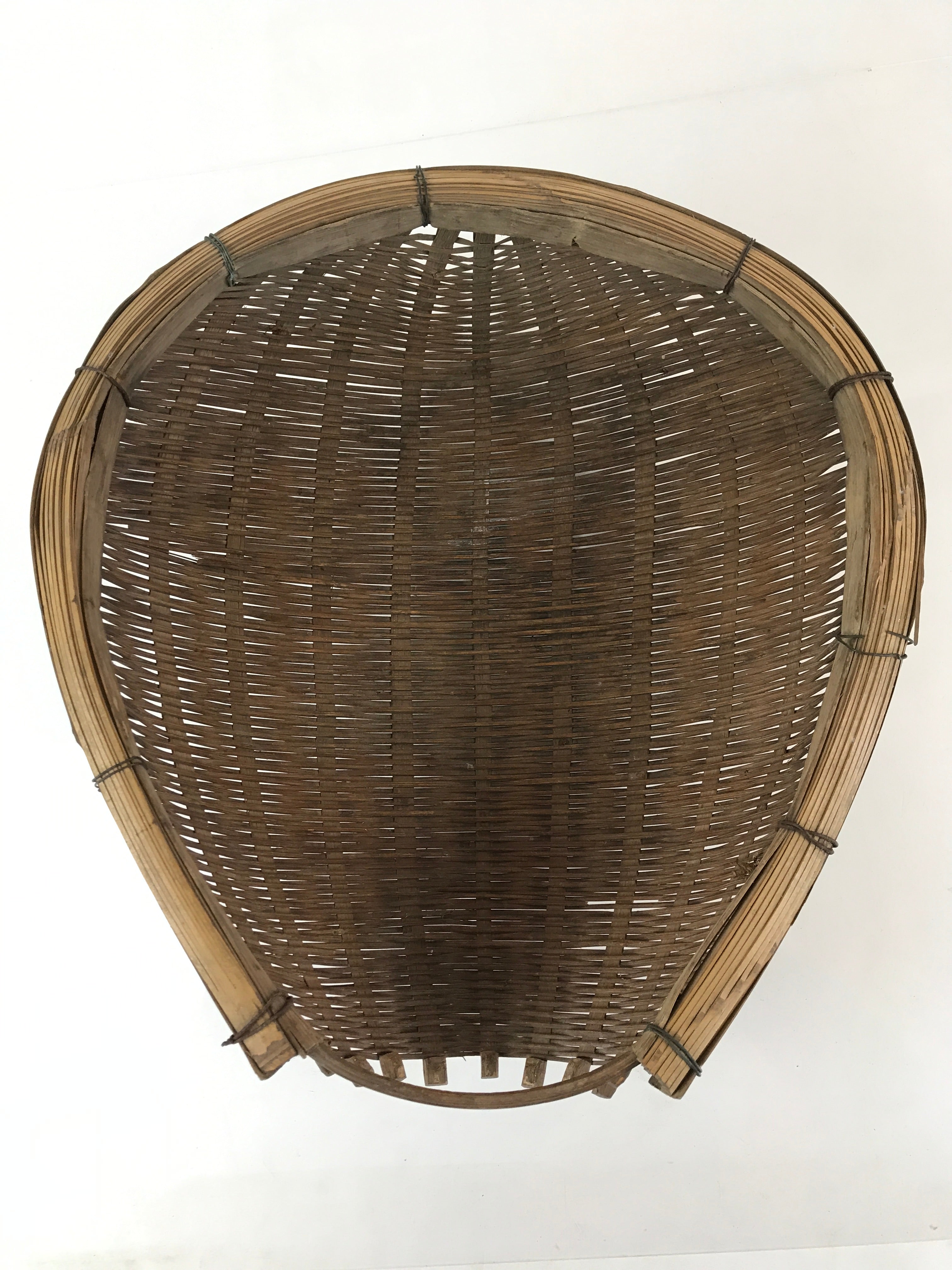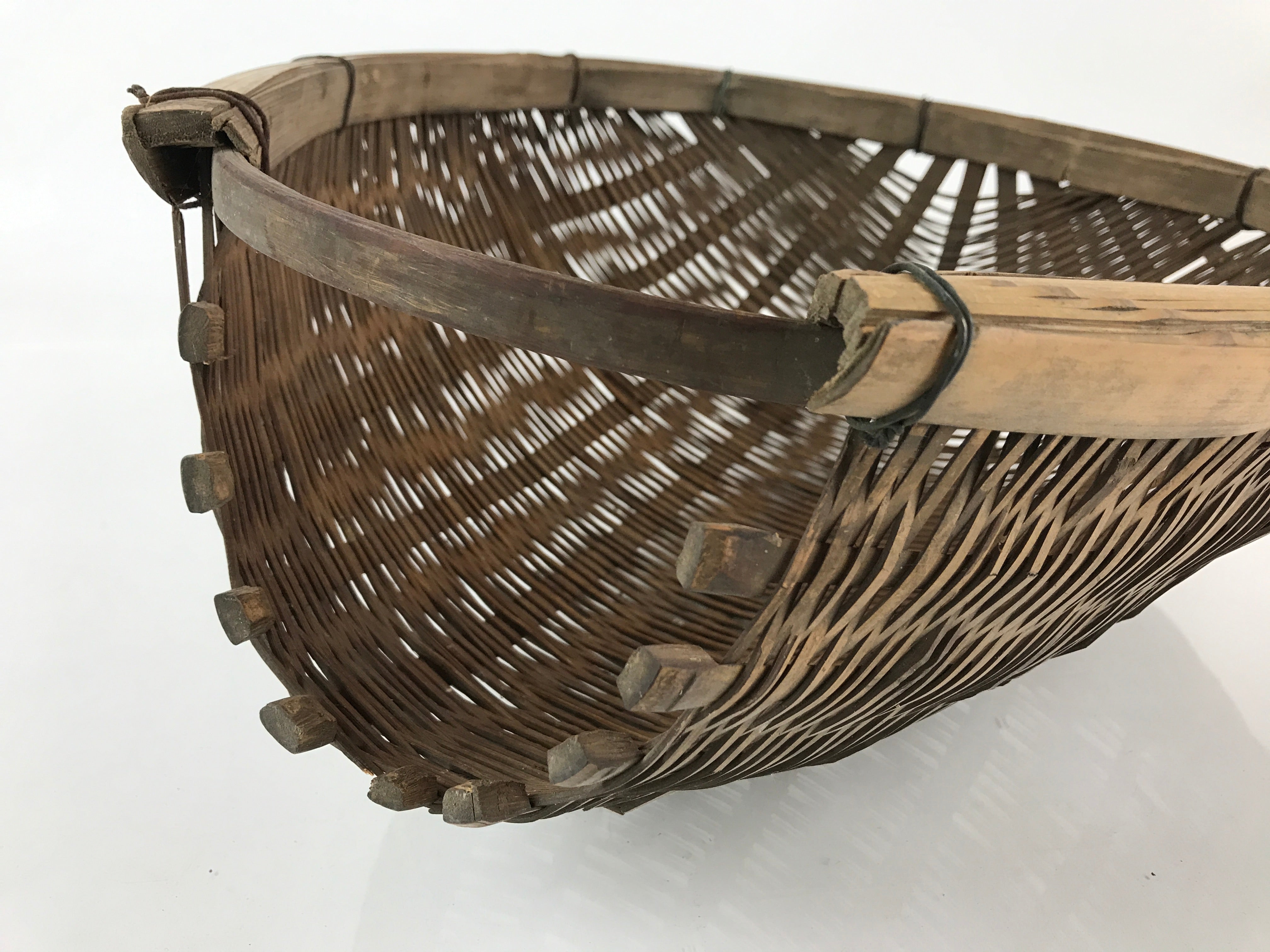 This is a traditional natural bamboo woven basket used for drying or draining water from various items such as tea leaves, small vegetables like edamame pods, etc. This particular type of handwoven zaru has one open side, giving it the name Kataguchi-zaru and is bound together by metal wire.