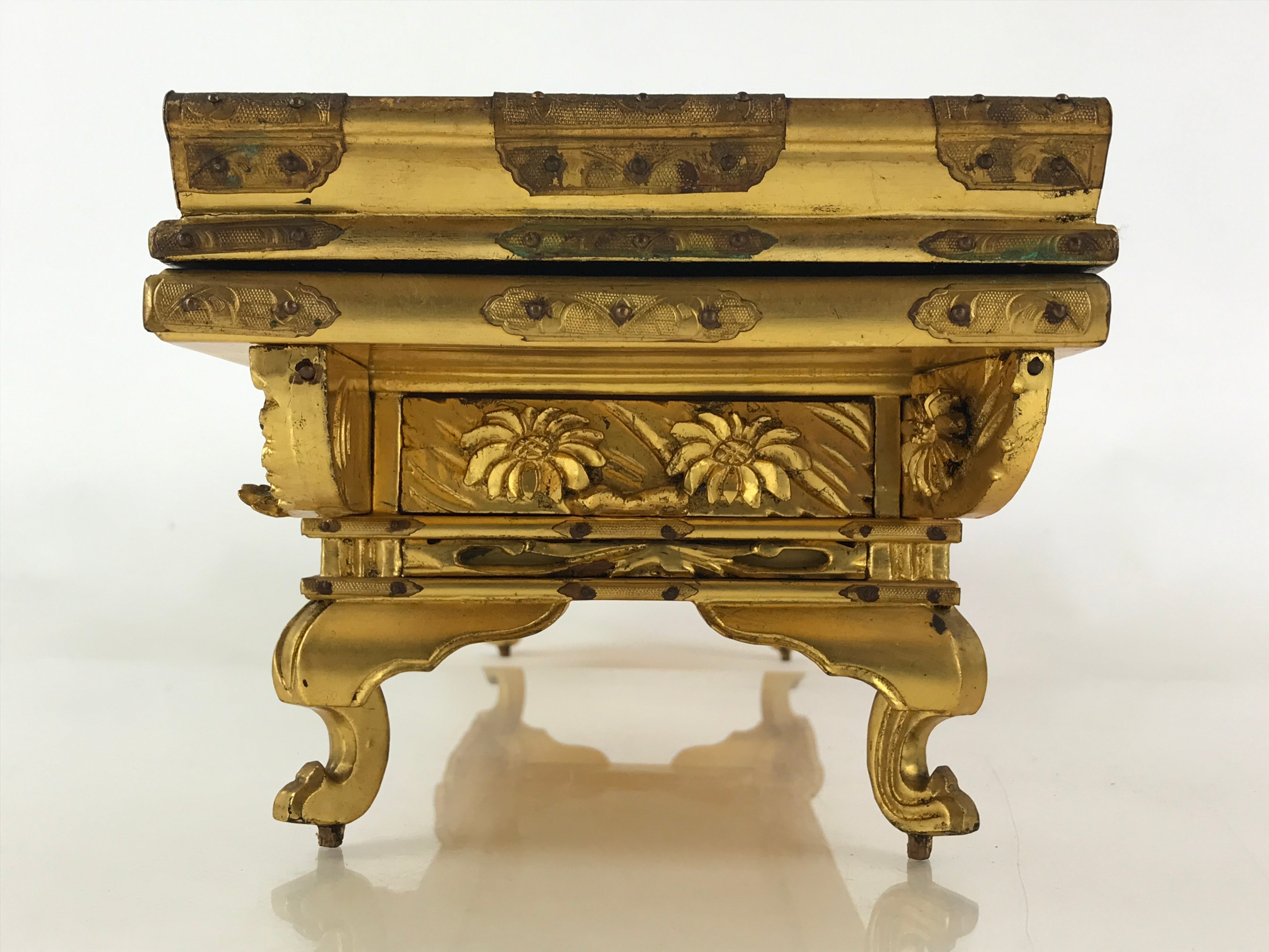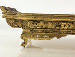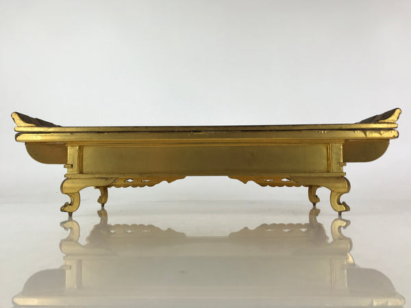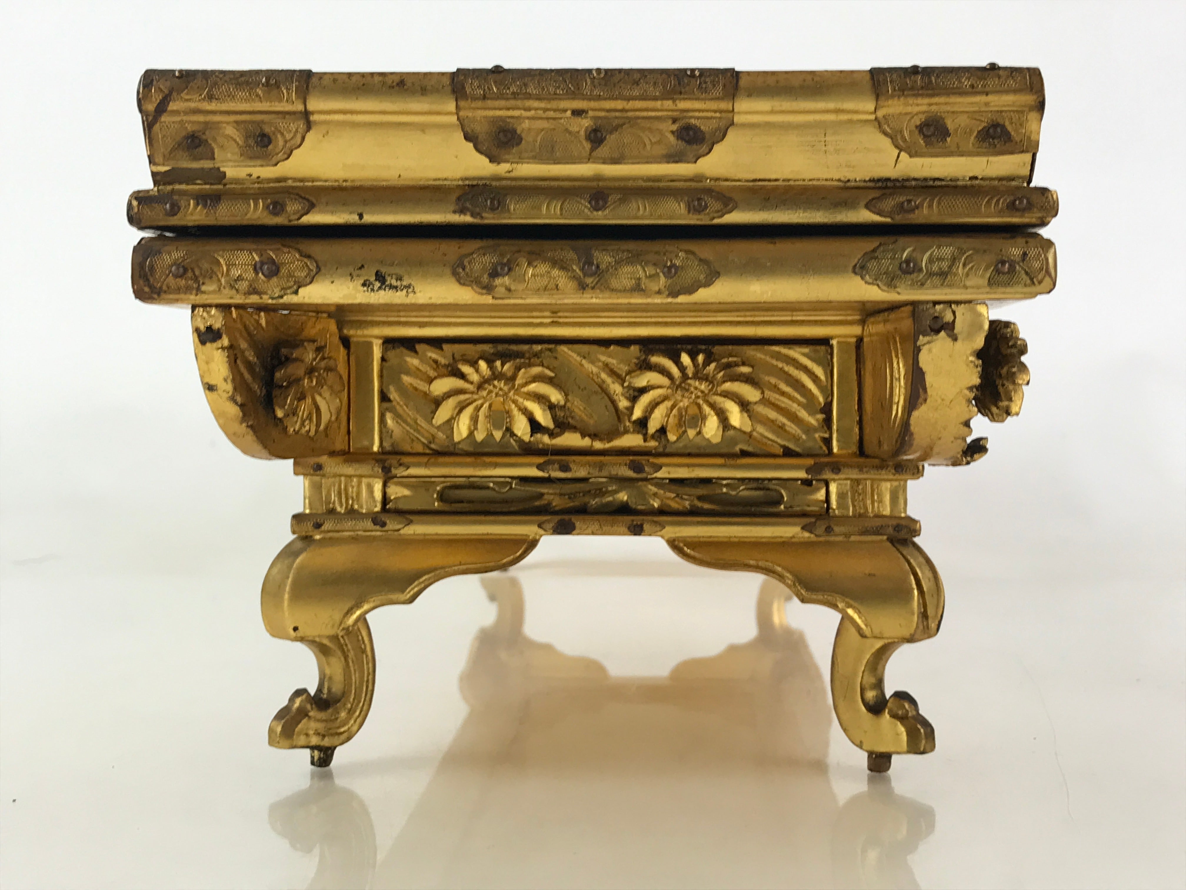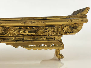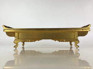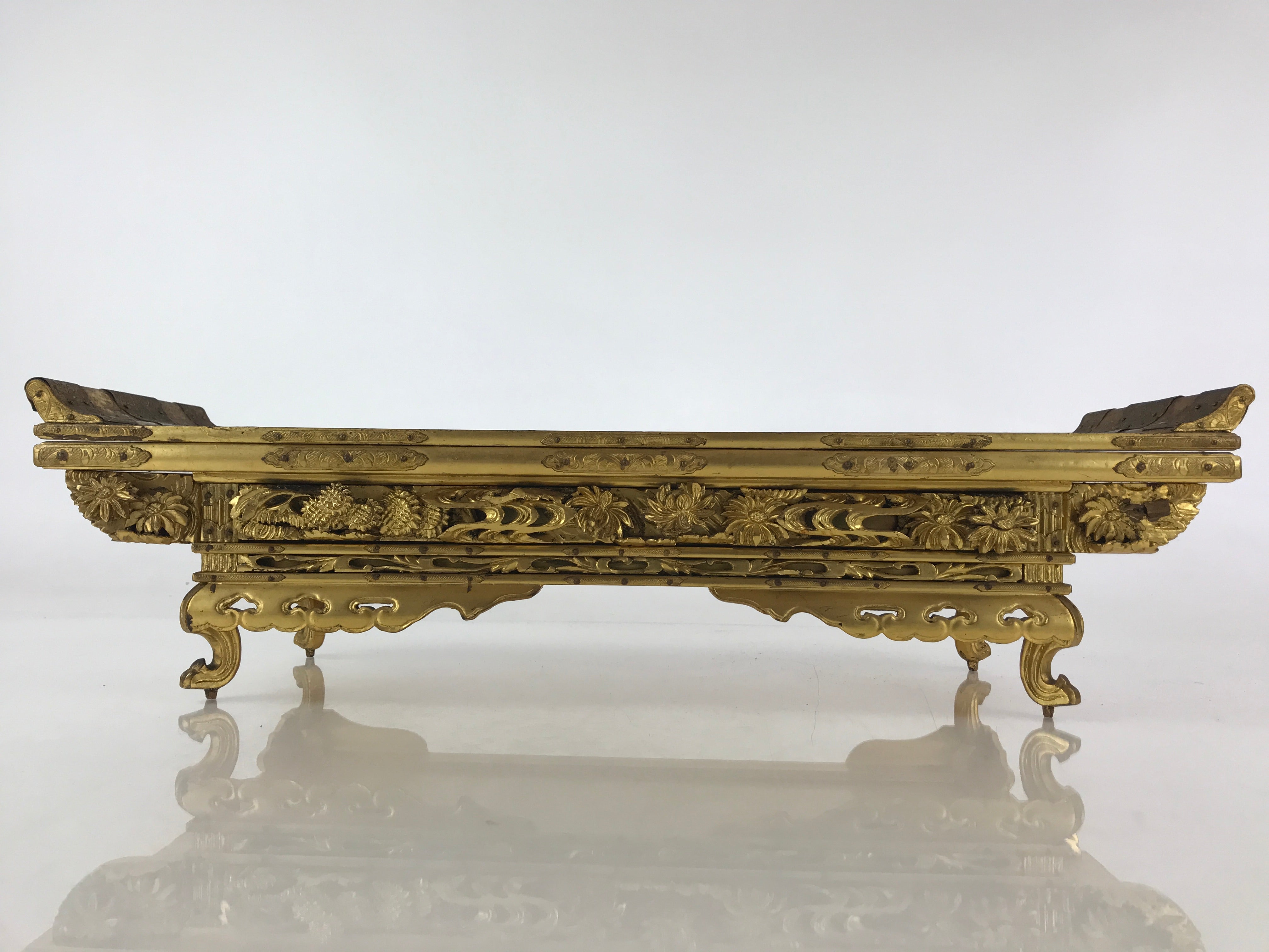 This is an antique Japanese Buddhist altar fitting wooden offering table Maejyoku. It is coated with gold and black lacquer. The table top can be removed. In the case of memorial services, a piece of cloth called Uchishiki is inserted here. There are two types of offering tables Maejyoku and Uwajyoku. Maejoku is placed in front of the Shumidan. It is used for 3 Gusoku (candle stand, flower vase, and incense burner). Uwajoku is placed in front of Amidanyorai. It is used for a flower vase, a rice cup, and a kasha incense burner.