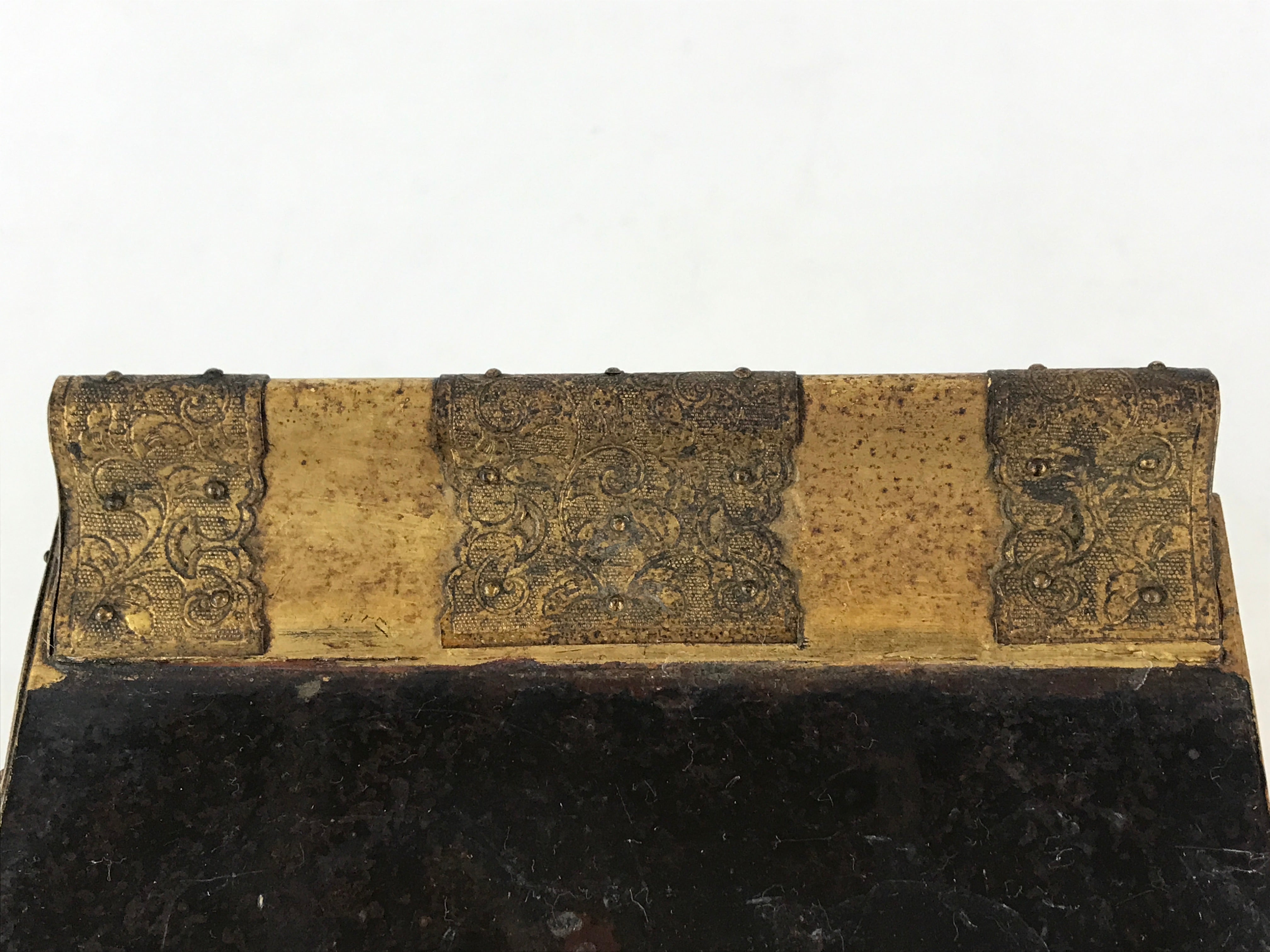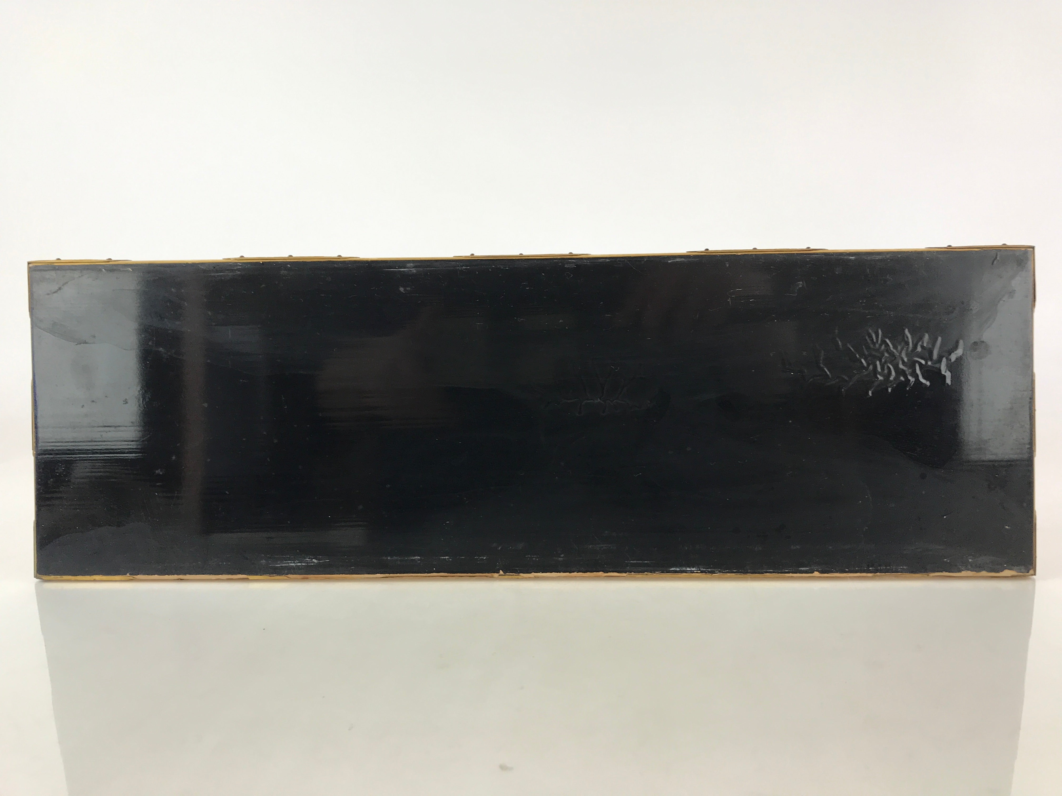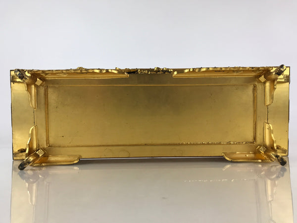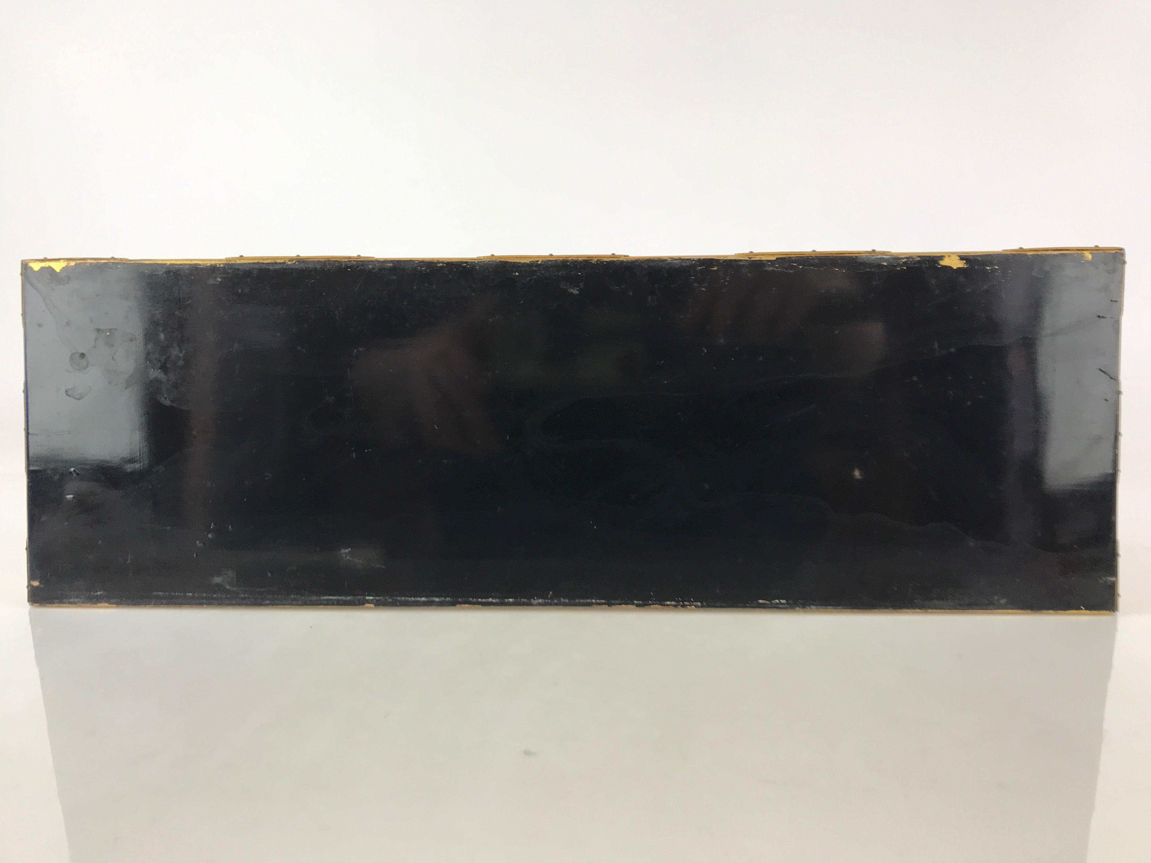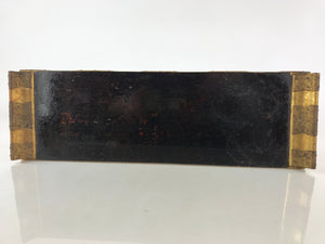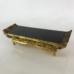 This is an antique Japanese Buddhist altar fitting wooden offering table Maejyoku. It is coated with gold and black lacquer. The table top can be removed. In the case of memorial services, a piece of cloth called Uchishiki is inserted here. There are two types of offering tables Maejyoku and Uwajyoku. Maejoku is placed in front of the Shumidan. It is used for 3 Gusoku (candle stand, flower vase, and incense burner). Uwajoku is placed in front of Amidanyorai. It is used for a flower vase, a rice cup, and a kasha incense burner.