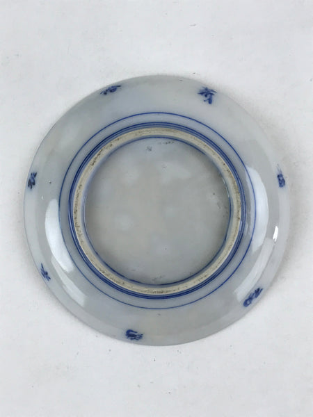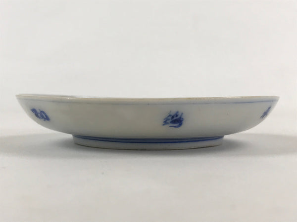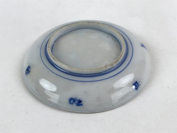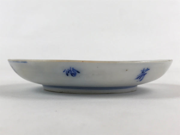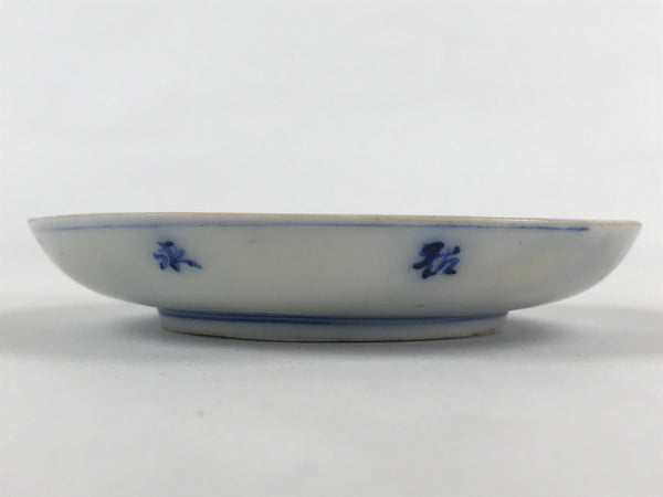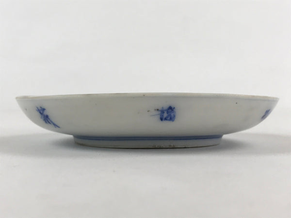 This is an antique Japanese ceramic small plate. This round plate is white and is adorned with a blue picture of a sitting woman having a break under the pine trees. There are several Japanese characters all around the outside of the plate. This small plate is perfect for putting small food or sweets such as cakes.