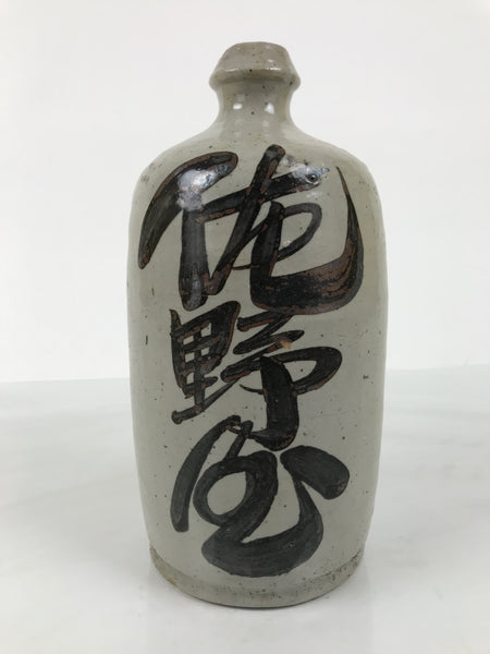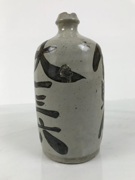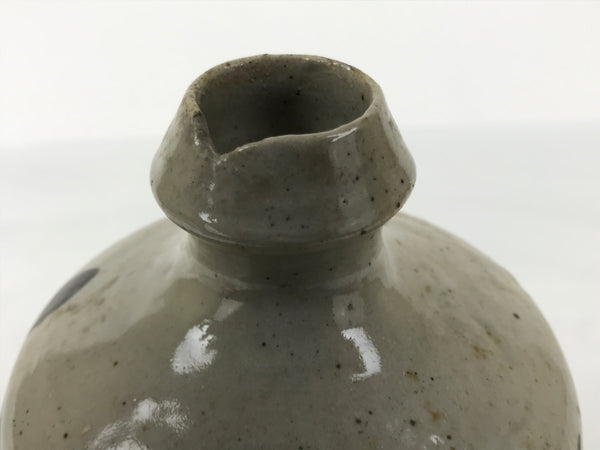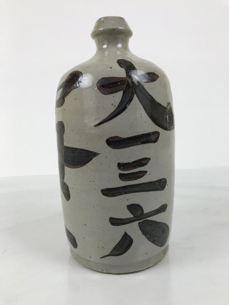 This is an antique Japanese ceramic sake bottle. It is called a Kayoi-Tokkuri and is used to pour sake. The commuting sake bottle became popular as a rental container for liquor stores in the Edo period when sake began to be consumed daily. This gray bottle has brown characters.