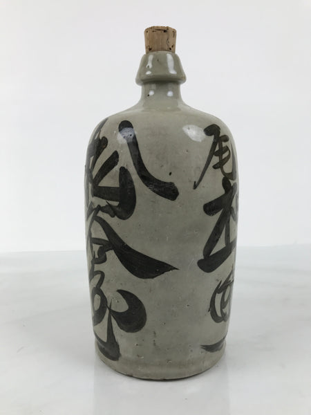 This is an antique Japanese ceramic sake bottle. It is called a Kayoi-Tokkuri and is used to pour sake. The commuting sake bottle became popular as a rental container for liquor stores in the Edo period when sake began to be consumed daily. This gray bottle has black characters. It has a cork.