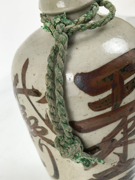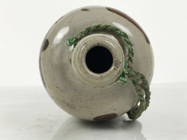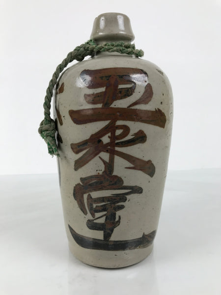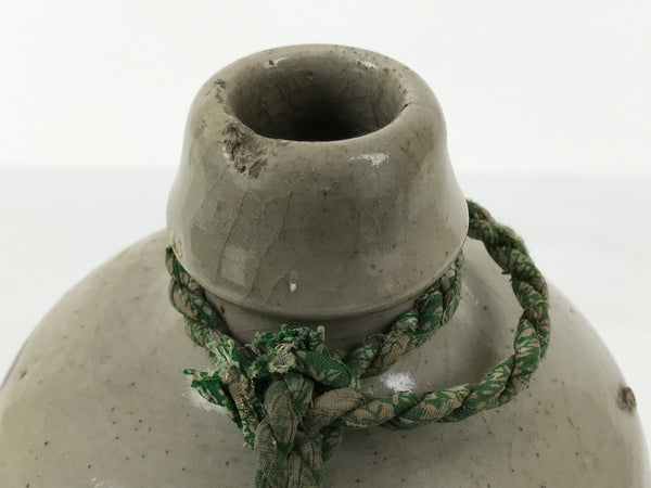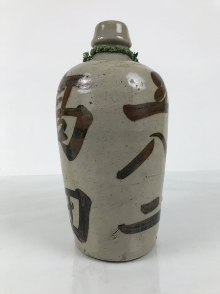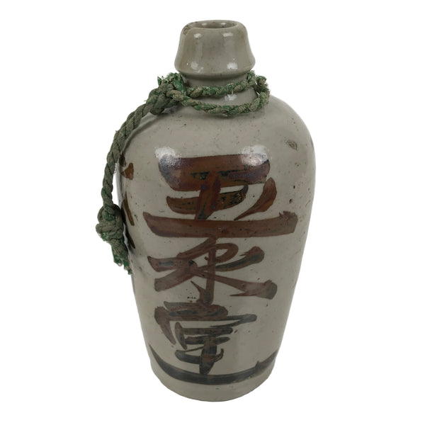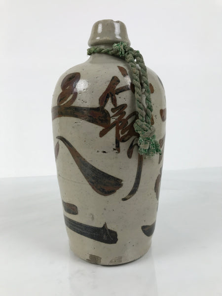 This is an antique Japanese ceramic sake bottle. It is called a Kayoi-Tokkuri and is used to pour sake. The commuting sake bottle became popular as a rental container for liquor stores in the Edo period when sake began to be consumed daily. This gray bottle has brown characters and a green string around the neck.
