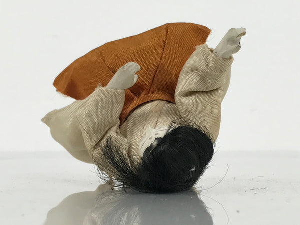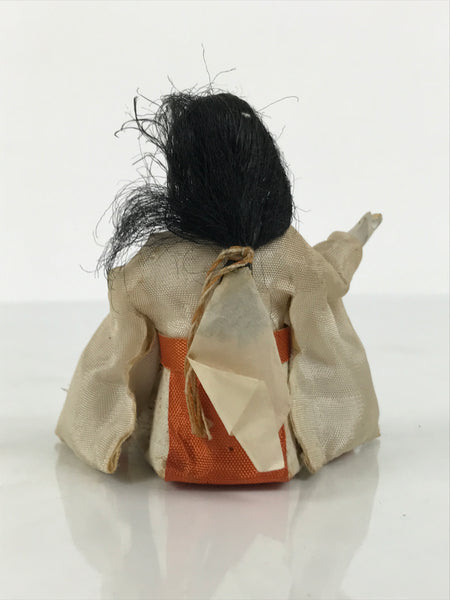 This Japanese antique court lady (nagae choushi) ohinasama doll dressed in a white and orange hakama-style kimono is the perfect addition to any existing hina set or adds gorgeous Eastern flair to any home decor. She typically holds a sake decanter with a long handle, but this piece is missing. She is sitting. The head and hands are made of wood covered with gofun. The head is removable.