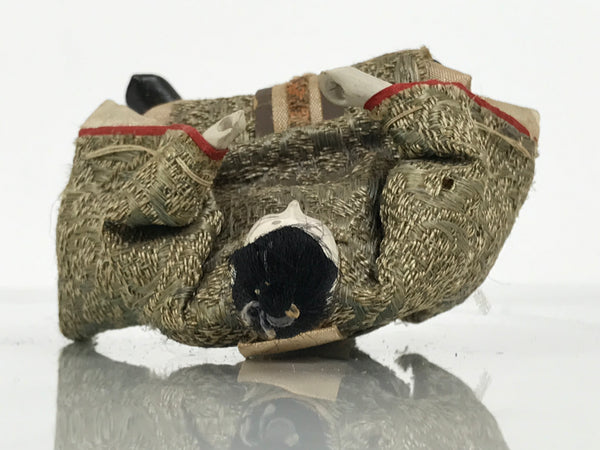 This Japanese antique young guard (zuishin) ohinasama doll dressed in a green kimono with red details is the perfect addition to any existing hina set or adds gorgeous Eastern flair to any home decor. He typically holds a bundle of arrows or a bow, but this piece is missing as well as the hat. This doll sits on an attached wooden stand. The head and hands are made of wood covered with gofun. The head is removable.