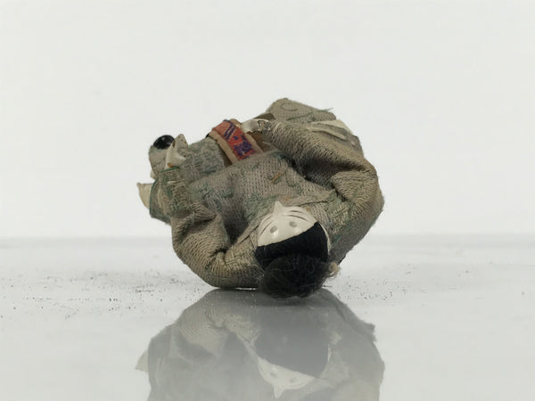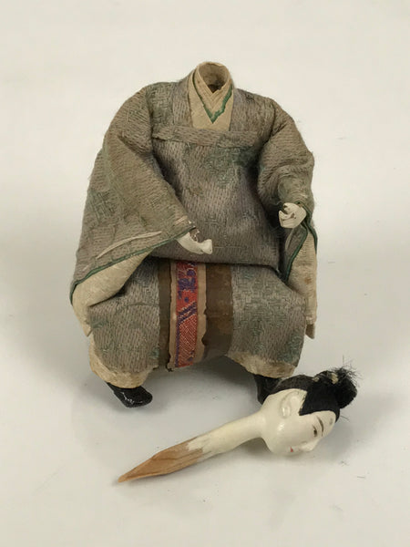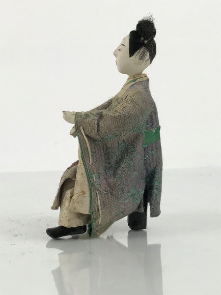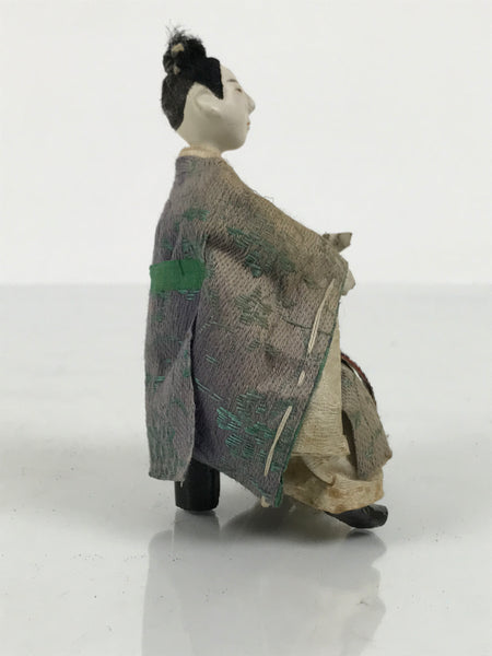 This Japanese antique young guard (zuishin) ohinasama doll dressed in a purple and green kimono is the perfect addition to any existing hina set or adds gorgeous Eastern flair to any home decor. He typically holds a bundle of arrows or a bow, but this piece is missing, as well as the hat. This doll sits on an attached wooden stand. The head and hands are made of wood covered with gofun. The head is removable.
