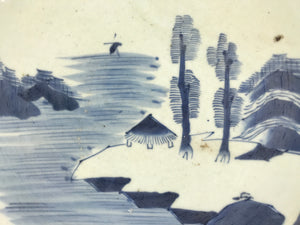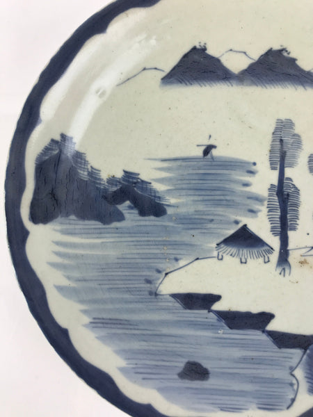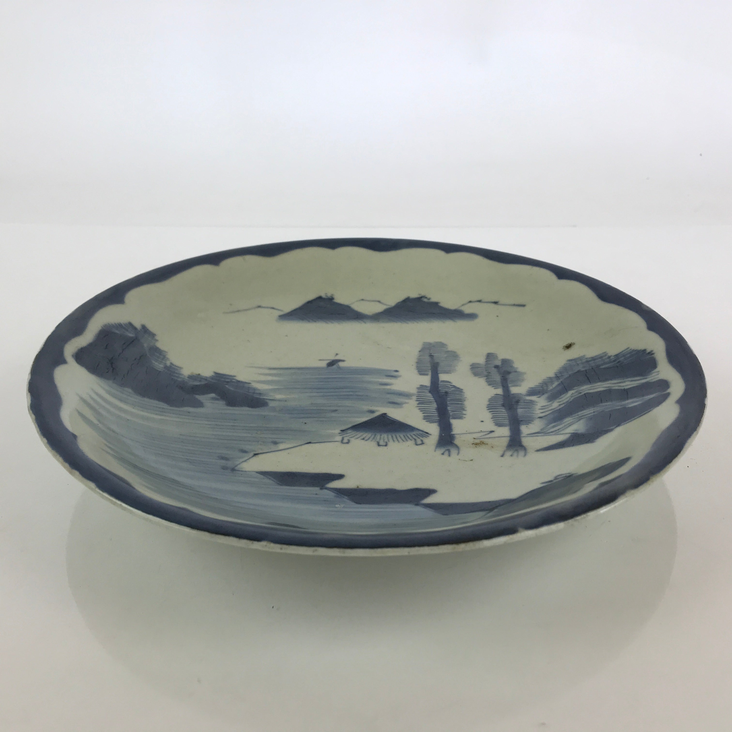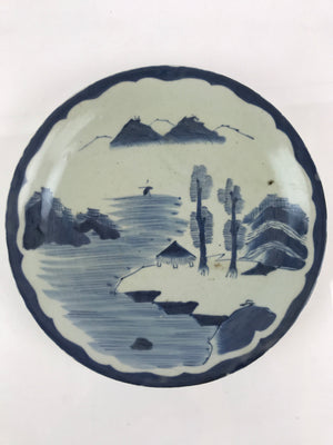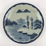 This is a large Japanese porcelain plate. This plate is ideal for serving sashimi, side dishes, parties, and banquets. This plate has blue sometsuke mountains and a river design. There are bottom support marks (Me-Ato) on the bottom.
