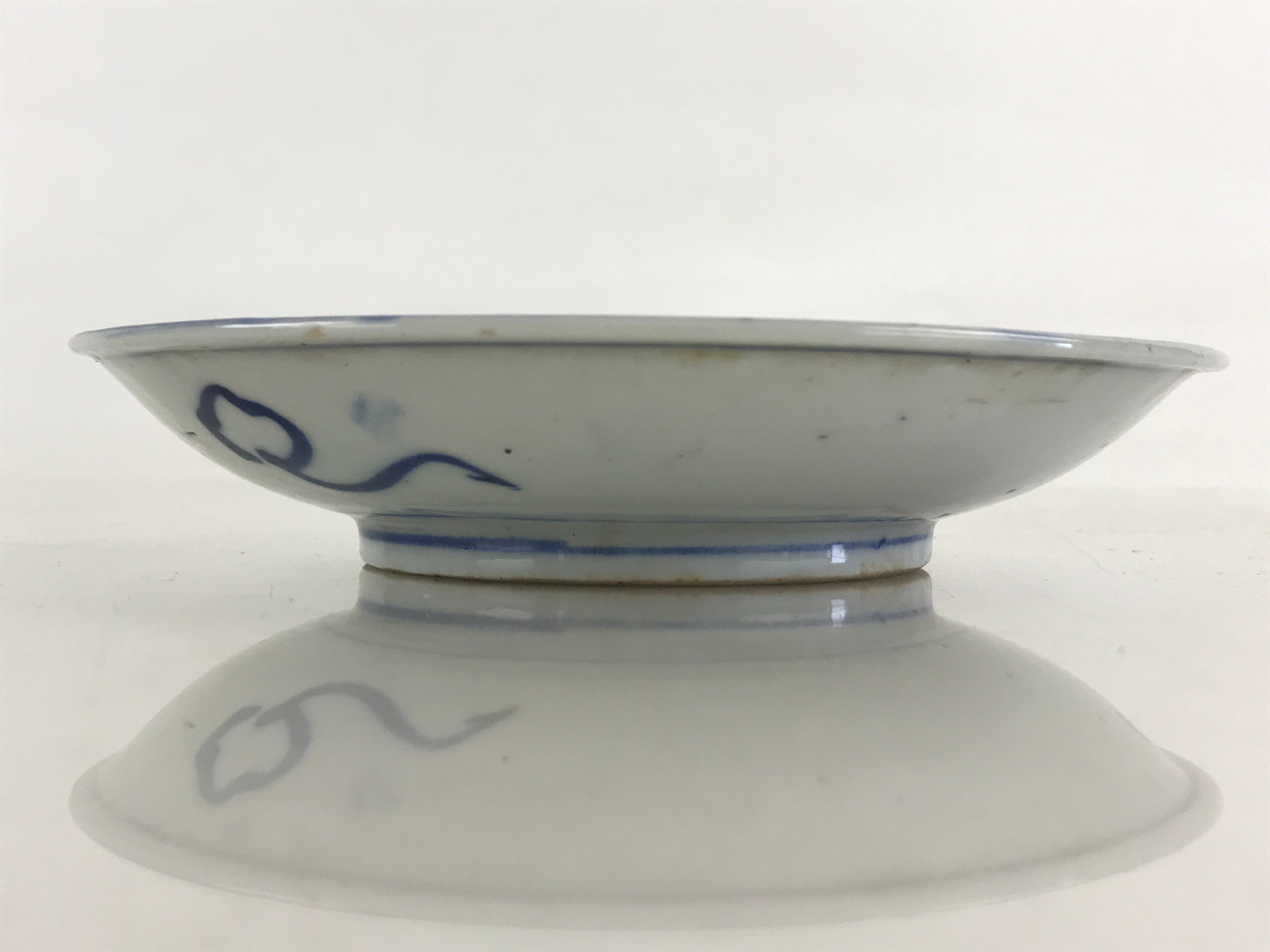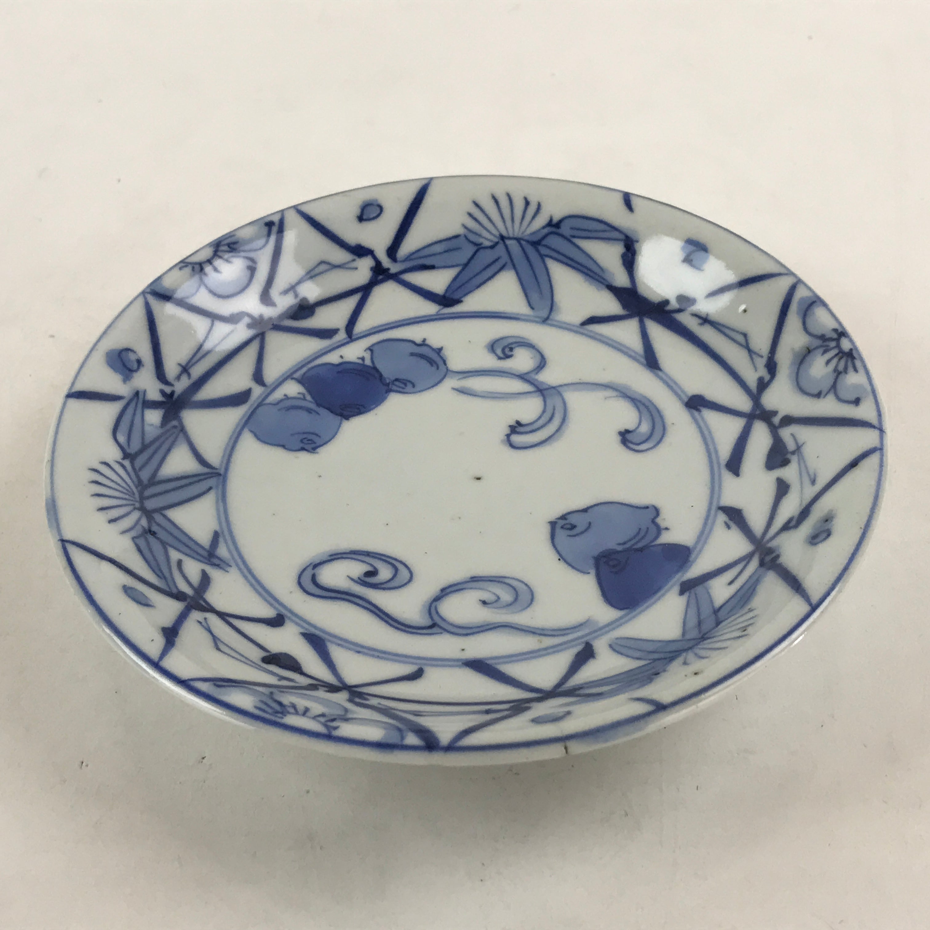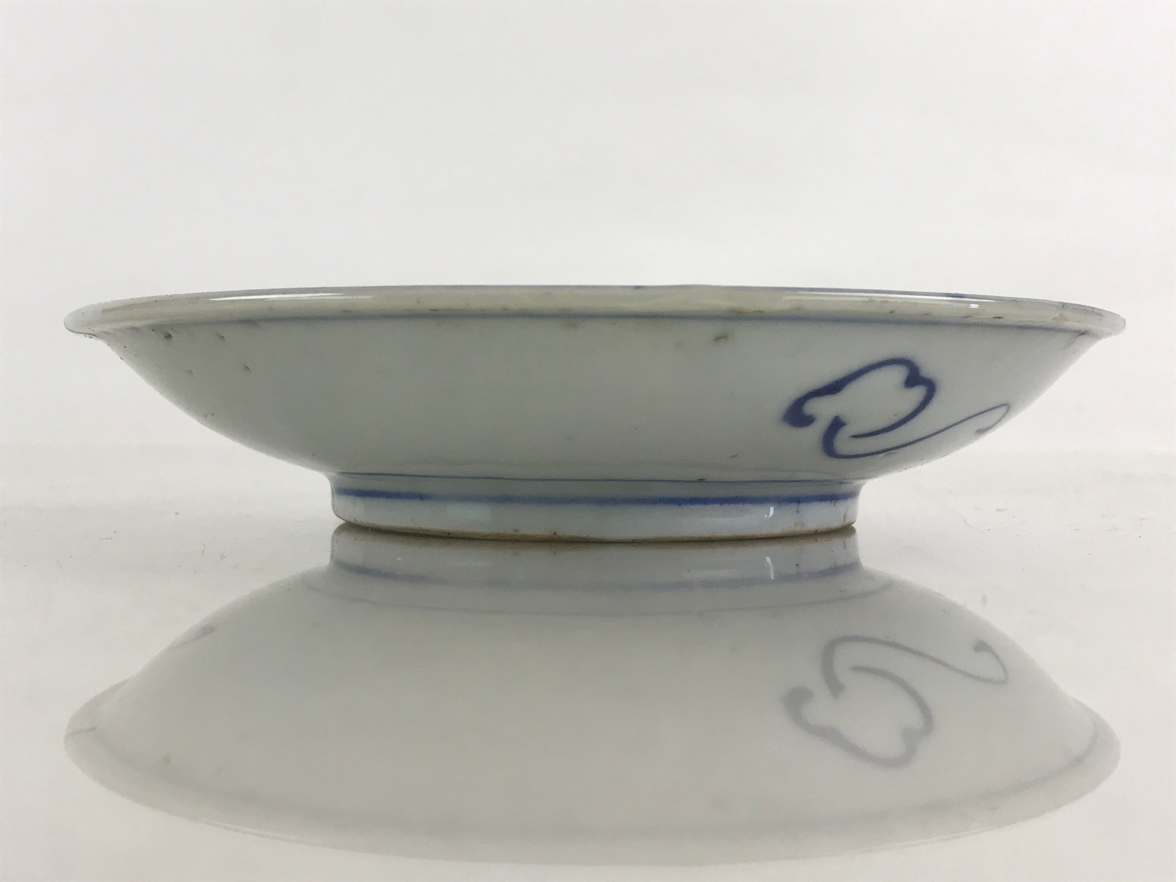 This is an antique Japanese porcelain side plate (Kozara). It has a blue Sometsuke picture of plum blossoms and little birds are drawn on it. Little distortion is seen in the plate. Because it was fired with firewood instead of gas or electricity as it is today, the temperature was not stable and easy to warp. There are goma (sesame spots) and dust marks in particular on the bottom. The marks of sesame and dust are the places where the ash fell when it was fired in the kiln.