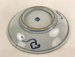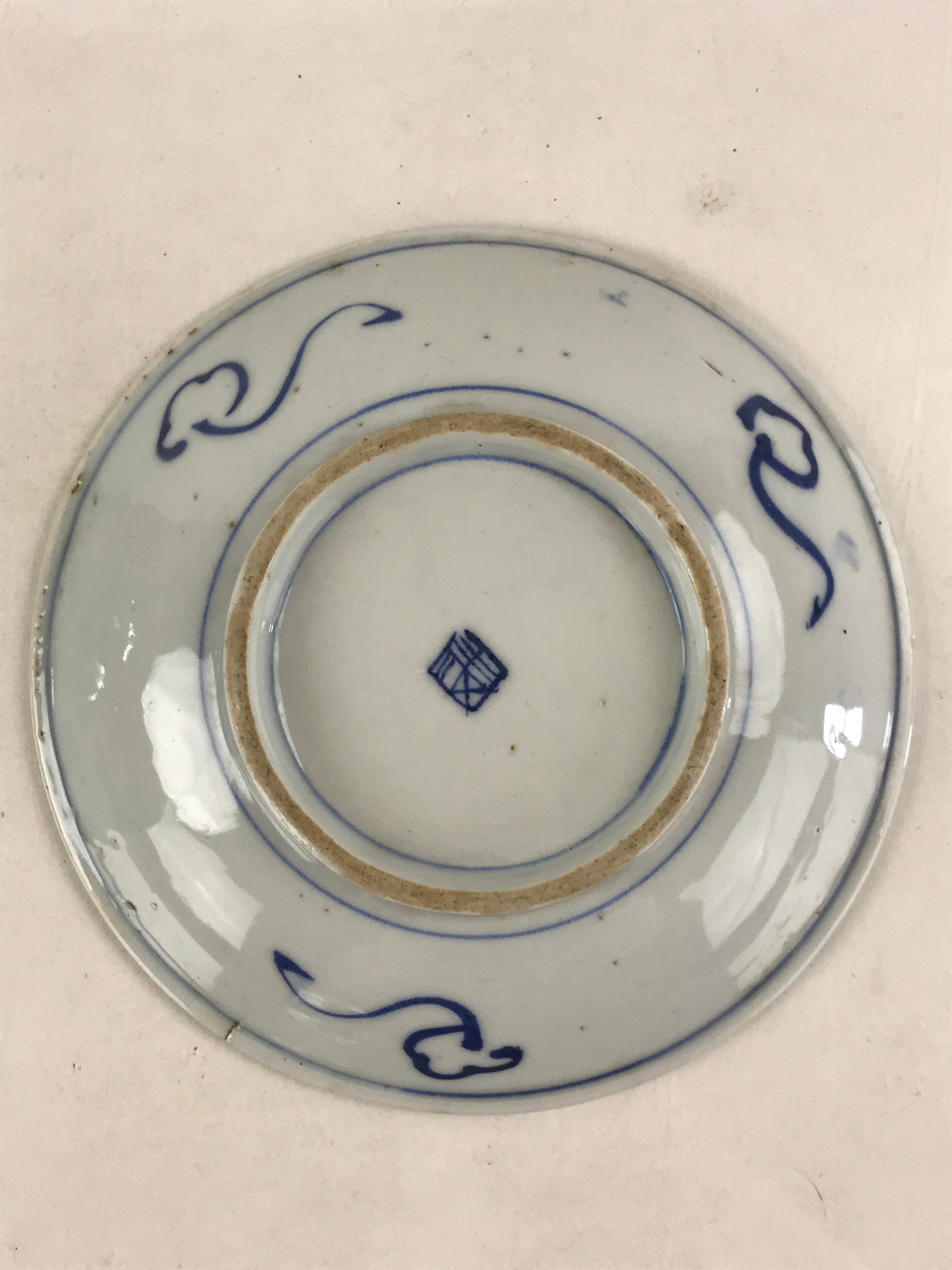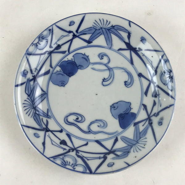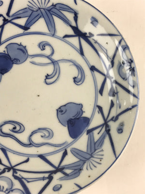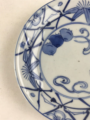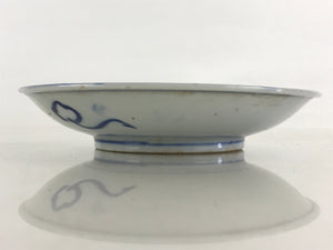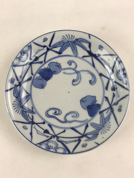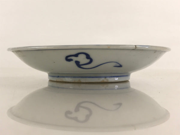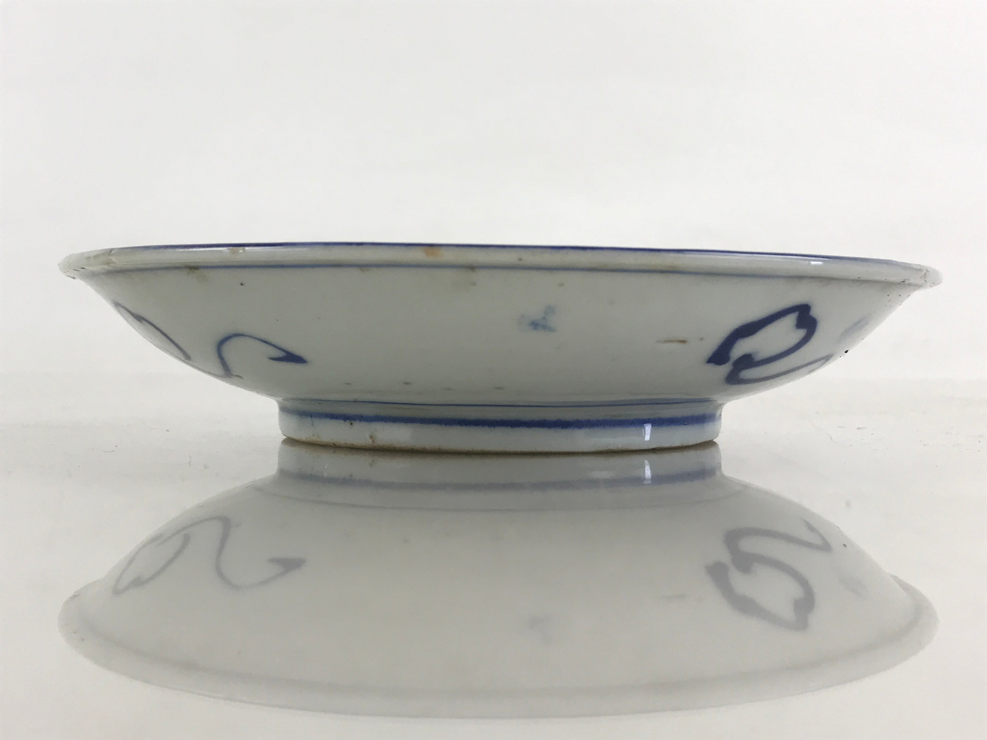 This is an antique Japanese porcelain side plate (Kozara). It has a blue Sometsuke picture of plum blossoms and little birds are drawn on it. Little distortion is seen in the plate. Because it was fired with firewood instead of gas or electricity as it is today, the temperature was not stable and easy to warp. There are goma (sesame spots) and dust marks in particular on the bottom. The marks of sesame and dust are the places where the ash fell when it was fired in the kiln.