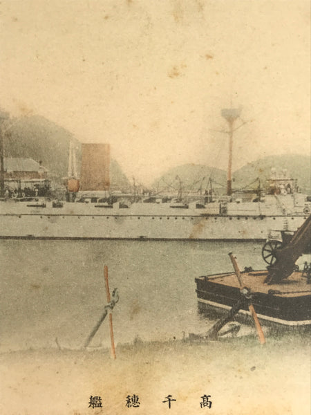 This is an antique Japanese souvenir postcard in color featuring a photograph of the cruiser Takachiho of the Imperial Japanese Navy. The colors are very light.