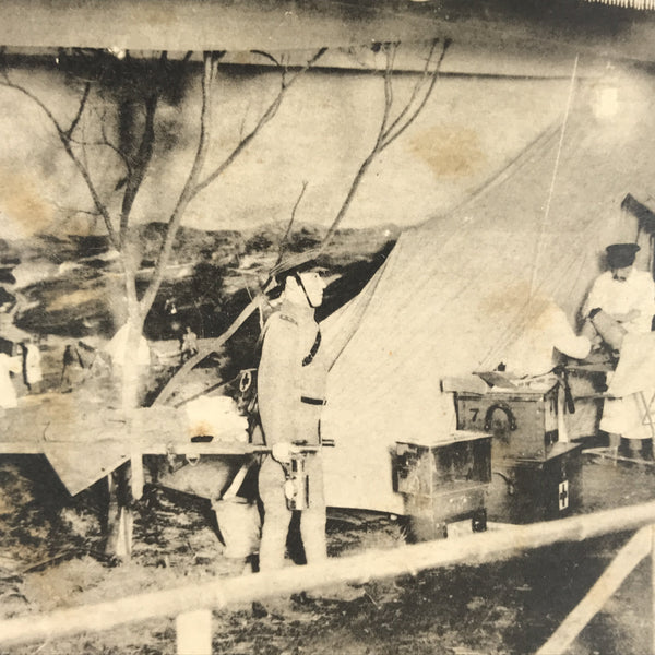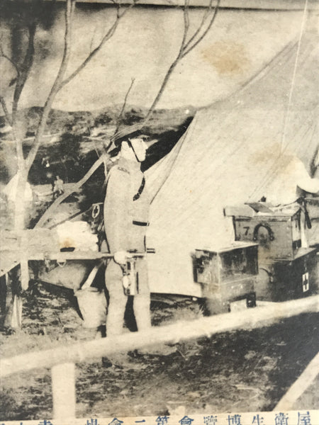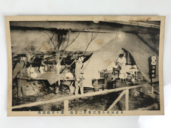 This antique Japanese postcard features a black-and-white photograph from the 1926 Nagoya Public Health Exhibition. This postcard focuses on the Red Cross panel, depicting mannequins carrying wounded people.