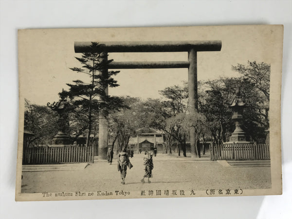 This antique Japanese postcard features a black-and-white photograph of the main torii gate of Yasukuni Shrine in Tokyo. People wearing kimonos and carrying children are also photographed. The caption is in Japanese and English.