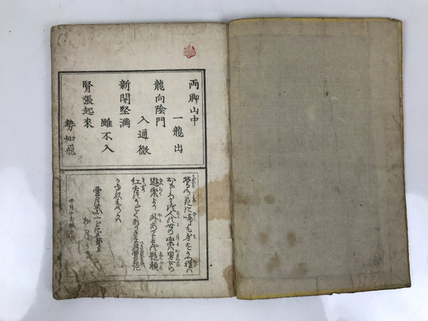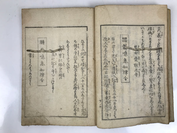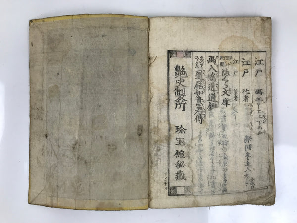 This is an antique Japanese Edo period art book of erotic shunga woodblock prints. It contains text and Shunga paintings. The title is 閨中紀聞枕文庫 keichu kibun makura bunko.