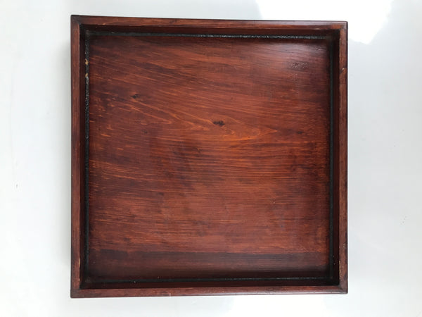 This is an antique Japanese lacquered wooden table or Ozen. This low square table has four walnut legs and is called Kurumi-zen. This item can be used as a small table or a serving tray. A signature is on the back.