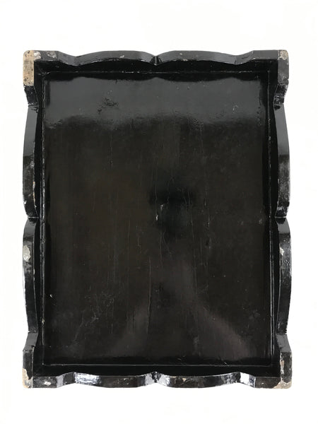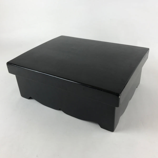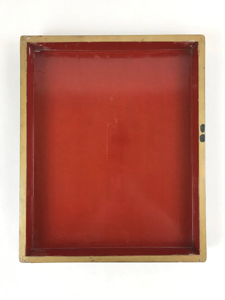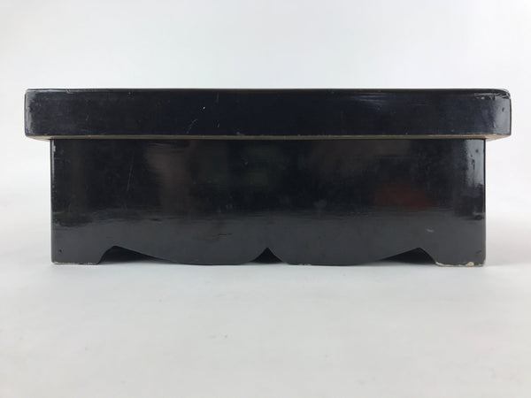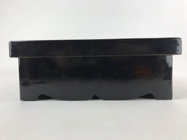 This is a Japanese antique lacquered wooden box with a lid. This rectangular box has the characteristic black on the outside and red on the inside look. The lid is slightly rounded and the bottom of the box has several cutouts.
