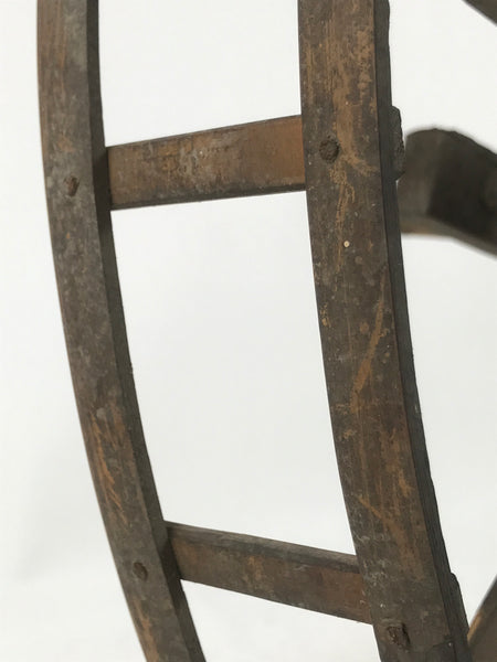 This is an antique Taisho Era manual spinning wheel (itoguruma) made of a combination of wood and bamboo. The outside wheel frame is made of strips of bamboo attached to wooden spokes and a fully wooden body. There is a crank on one side that turns easily. The base has a long piece of wood that sticks out and is attached to block with two vertical pieces and braided straw cords (the block is adjustable).