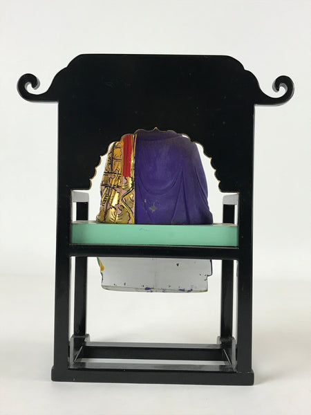 This is a Japanese vintage carved wood figurine of Keizan (or Taiso Josai Daishi), founder of the Soto school of Zen in Japan. This wooden figurine is painted in purple and green, and has embellishments in gold color. The figurine is sitting on a lacquered wood stand in a classic Buddhist black and gold style.