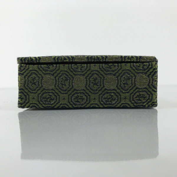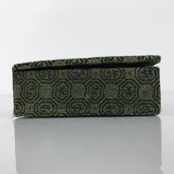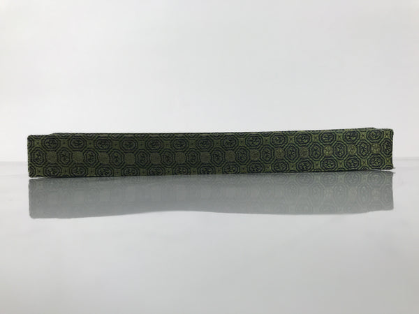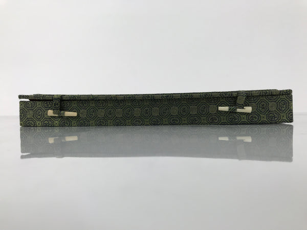 This is a vintage Chinese set of three calligraphy brushes (shuji fude).  The brushes are stored in a fabric case with two catches. The outside of the fabric case is green with a geometric pattern, and the inside is red with a pattern of something like clouds and half of crests. The case is available for five brushes, though this set has three. Some inscriptions are on the handles of brushes. They are made from bamboo and animal hair, such as horse tail.