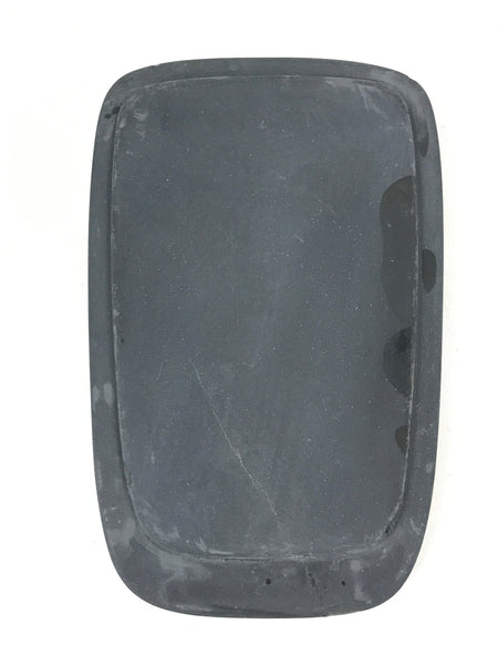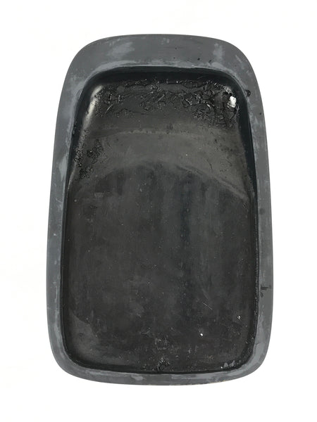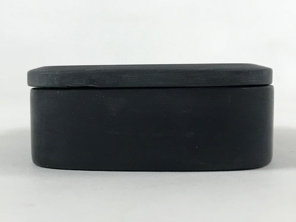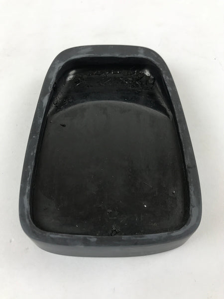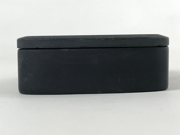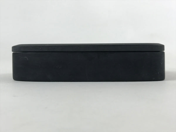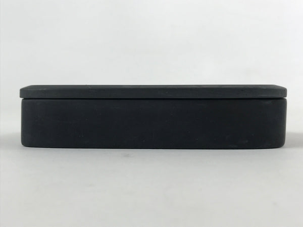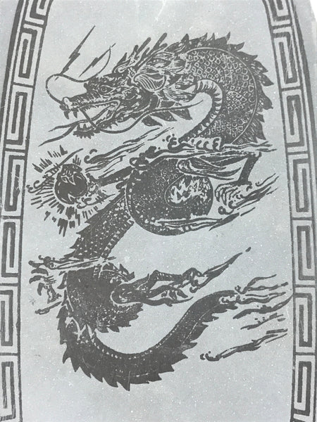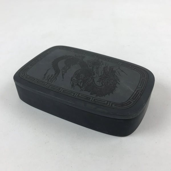 This is a lidded Chinese inkstone, suzuri, used for grinding sumi and holding ink. It is a necessary tool in calligraphy (shodo) and traditional penmanship (shuji). It is made of a grayish black stone. The lid displays a Chinese border pattern as well as a detailed dragon image.