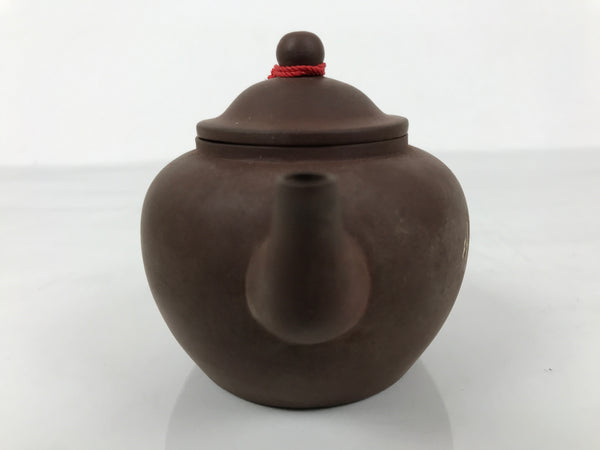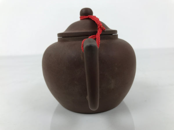 This is a vintage Chinese Yixing lidded teapot perfect for having Chinese tea. A red string connects the handle and the lid and prevents the lid from falling off. This small teapot is brown and features kanji on the side.