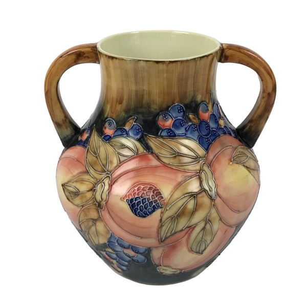 This is a vintage English ceramic flower vase, or kabin. This Old Tupton or Moorcroft-style vase features some peaches and berries with textured hand-painted lines. It has a round body and two handles from the rim to the shoulder. The base is brown, the inside is pale yellow, the peaches are pink and yellow, and the berries are dark blue.  It makes a beautiful decorative item. This vase can be used for all types of flower arrangements both ikebana and casual.