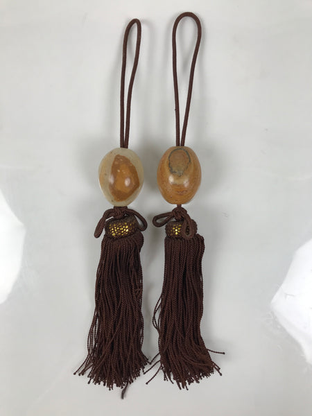 This is a pair of Japanese hanging scroll (kakejiku) weights, or fuchin. Fuchin is a decoration that hangs on both ends of the bottom of a hanging scroll. It's a decoration as well as weighing the scroll down to keep it straight and keep it steady in a breeze.