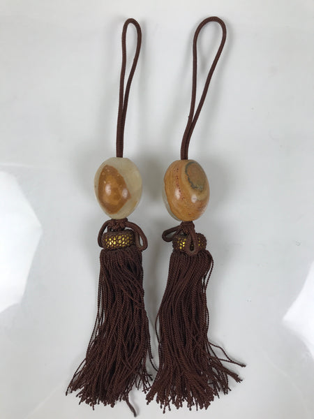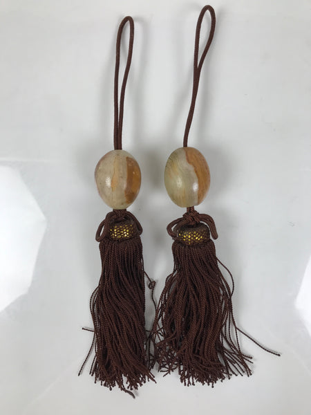 This item features natural agate stones in an egg or oblong shape with a layered and banded pattern that includes touches of brown, beige, orange, and gray. It has chocolatey brown tassels with a gold accent underlayer at the head.