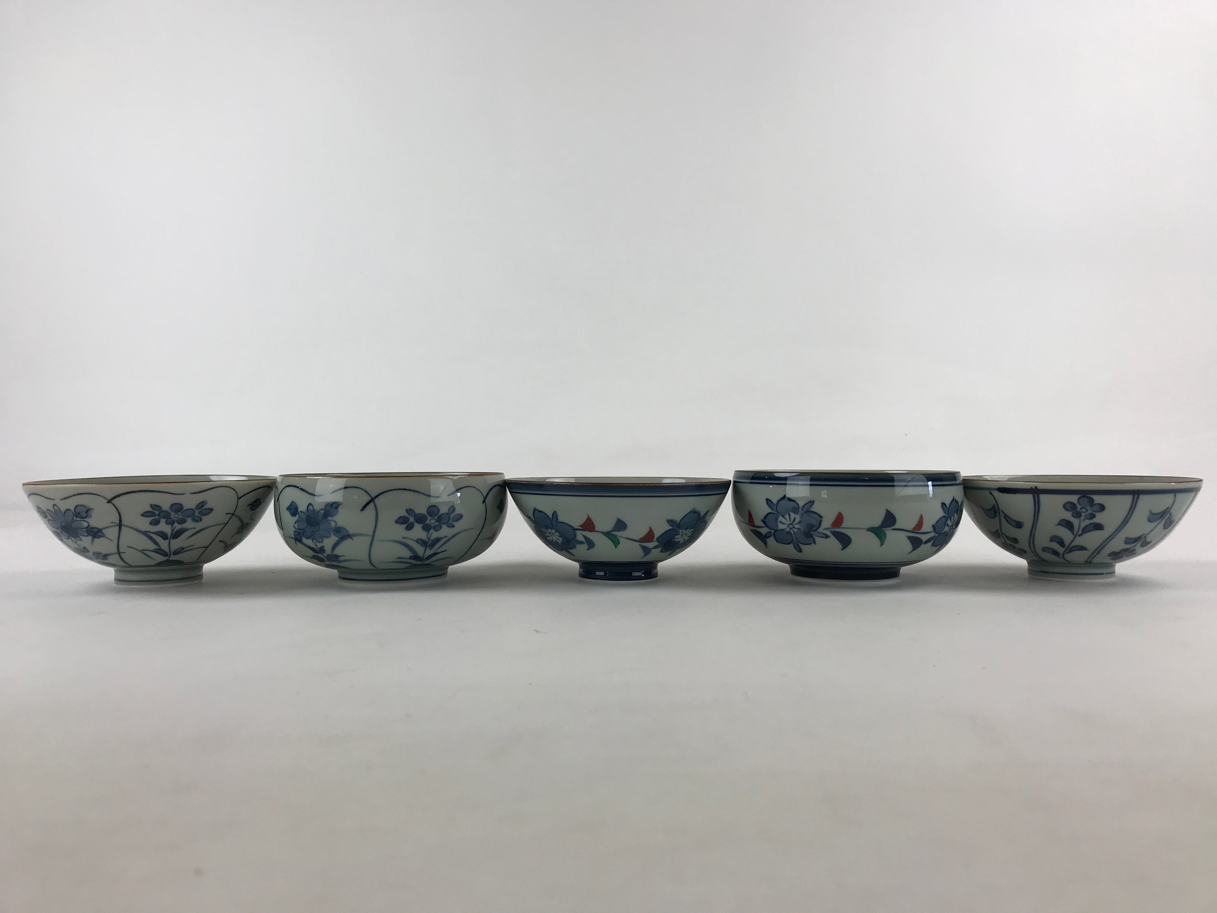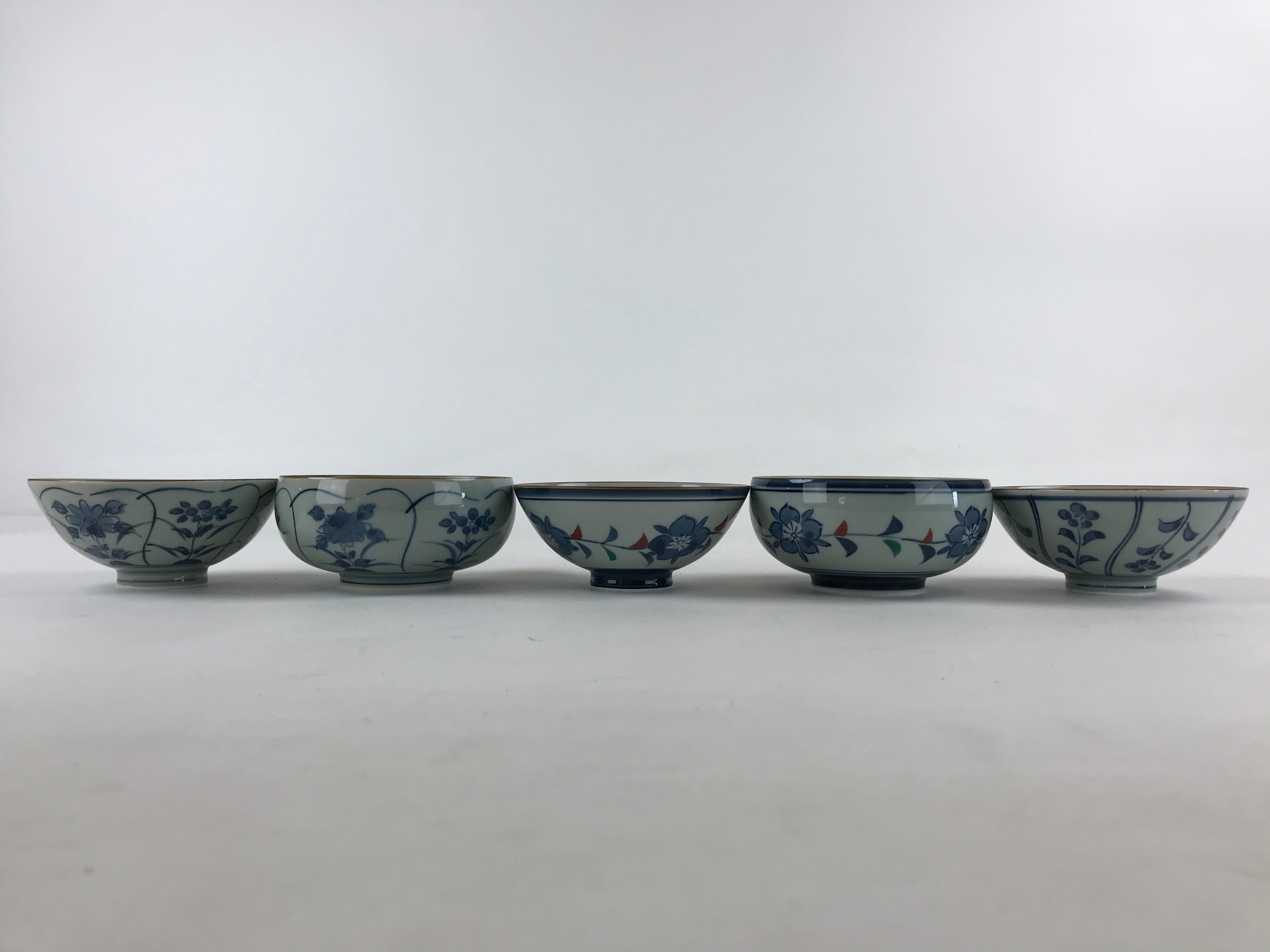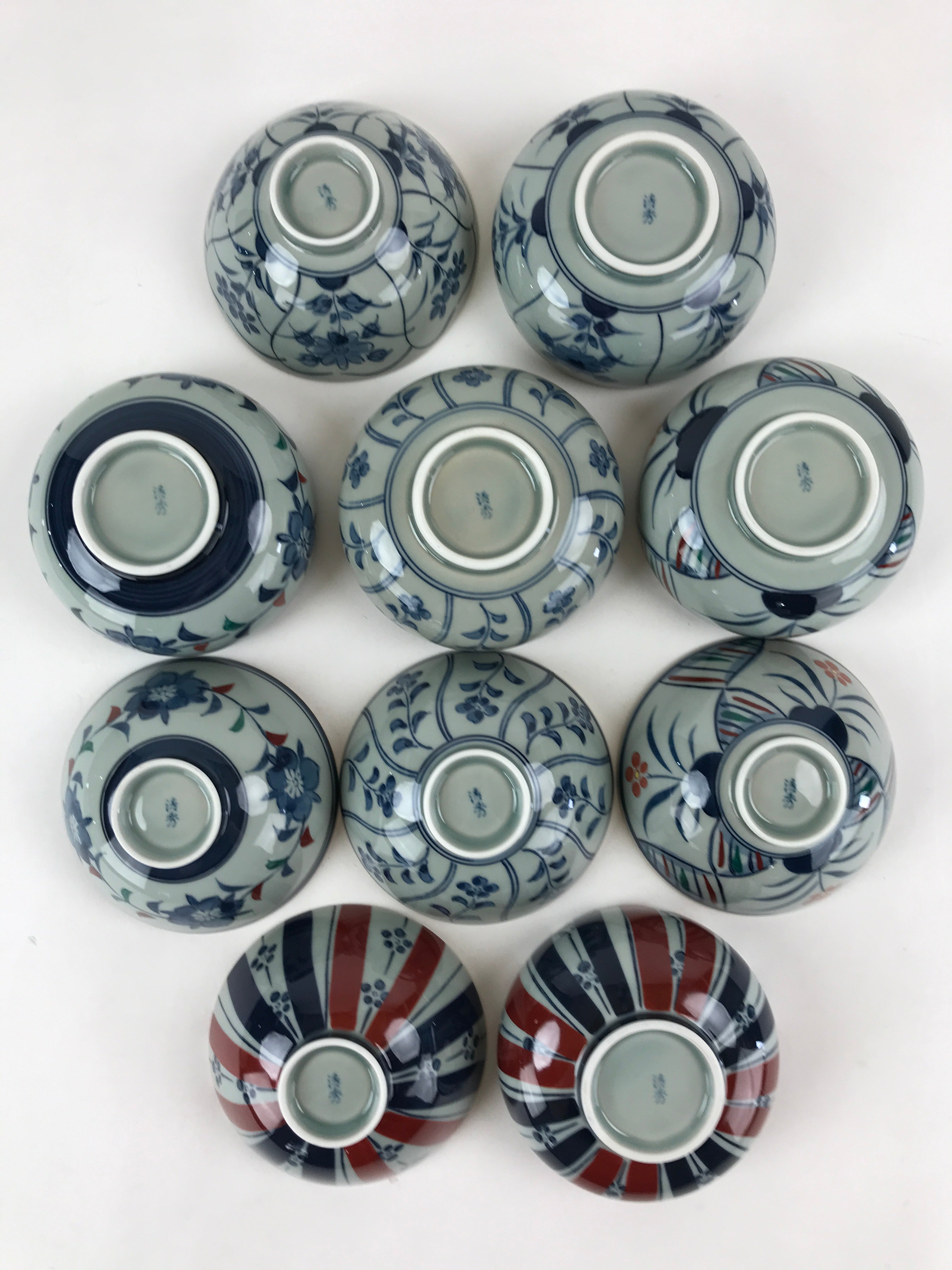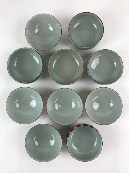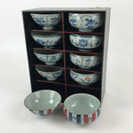 This is a Japanese vintage porcelain Arita ware Asahide kiln 10pc bowl set. There are 5 pairs of bowls and rice bowls, each with 5 different designs. All bowls are painted with flowers. These bowls are packed in a black lacquered wooden box.