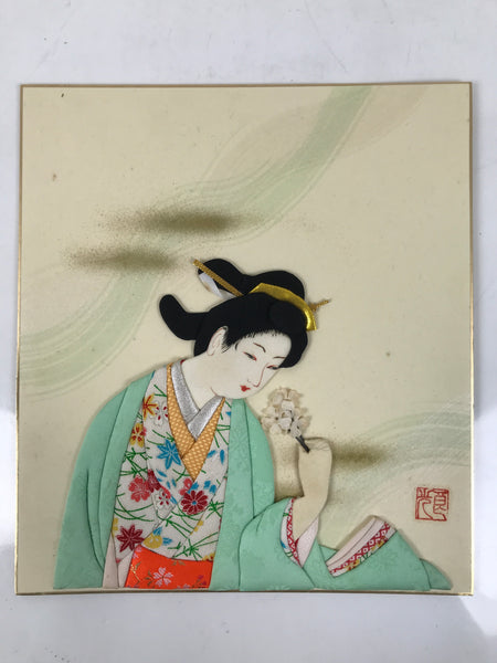 Japanese Shikishi Art Board Oshie Fabric Vtg Kimono Woman Geisha Floral A693