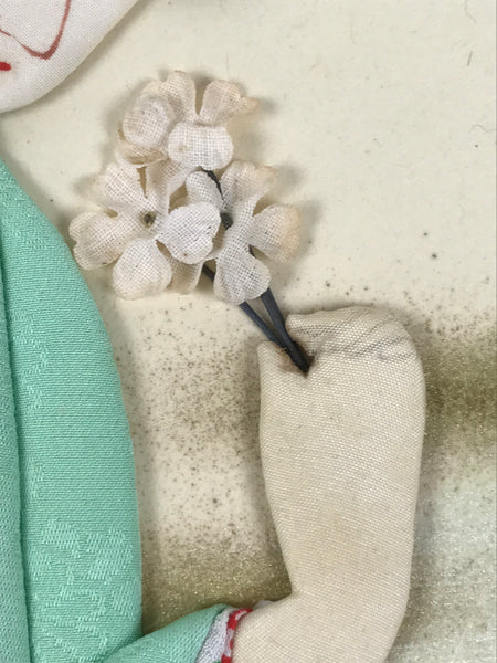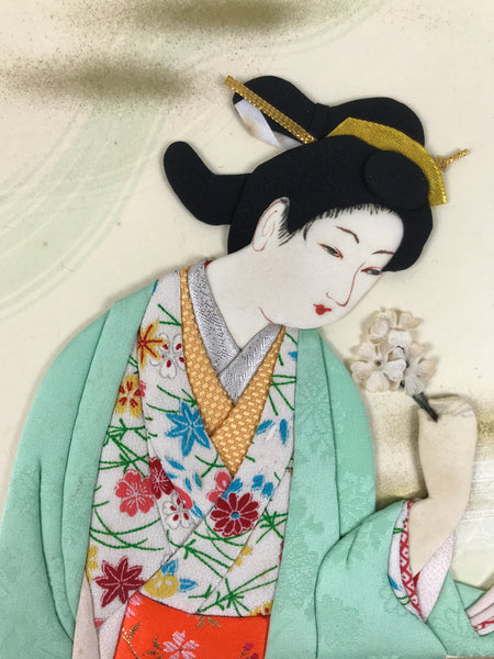 This vintage Japanese shikishi art board features an oshie (Japanese patchwork) design of a woman wearing a white floral kimono with a light green overcoat. The woman is holding flowers in her hand. This piece is signed with a red seal.