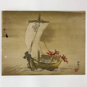 This item is Japanese shikishi art board. It is a printed reproduction of the artwork Takarabune (Treasure Ship) by artist Hashimoto Kansetsu. It represents a sailing ship loaded with goods. There is a Japanese character on the white sail of the ship. Takarabune is the ship of the Seven Lucky Gods.