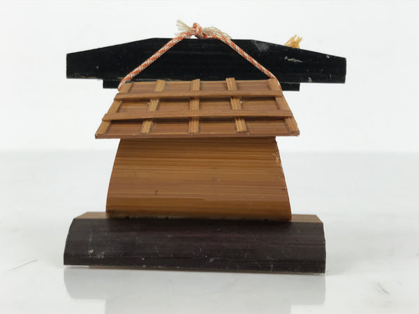 This is a vintage Japanese bamboo doll figurine. It is a couple of figurines in Kimono standing in a palanquin. The palanquin is made of a bamboo tube with a red interior, a blue door frame, and a black pole with gold sprinkles. A red-and-white braided cord is tied on the palanquin's roof. The palanquin is on a bamboo stand, and its front is colored gray. There is an inscription on the palanquin.