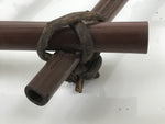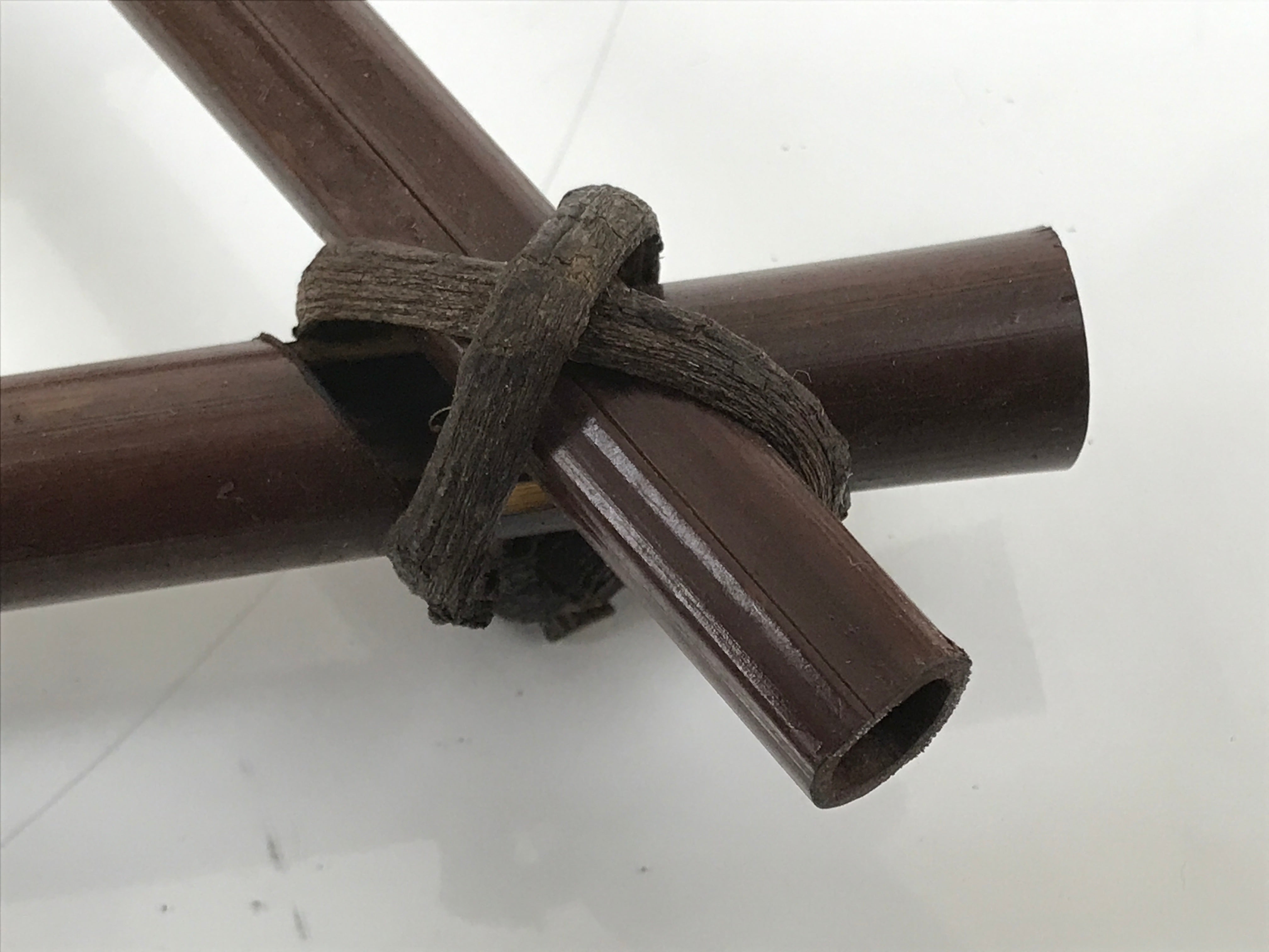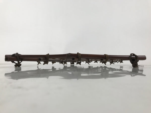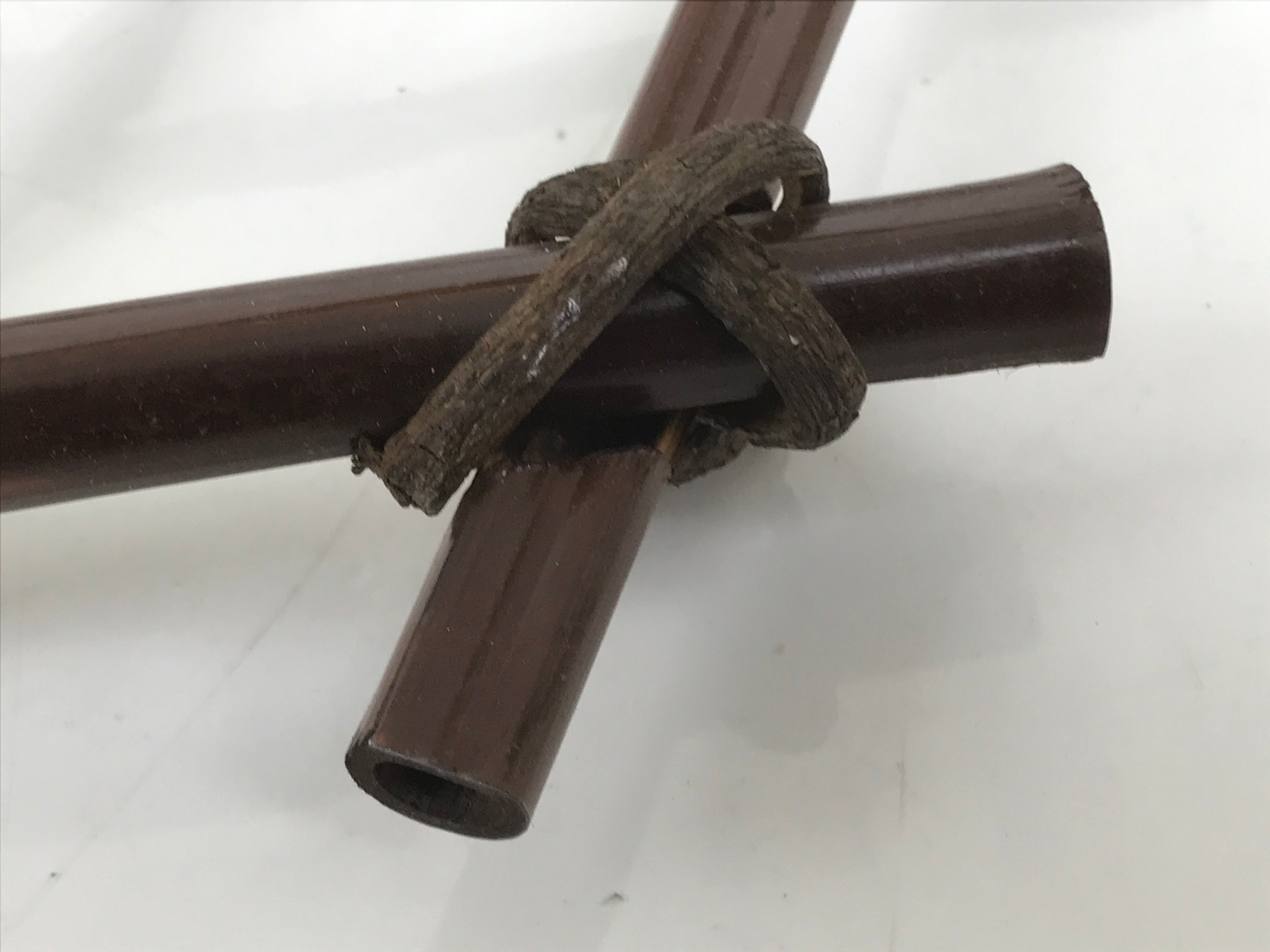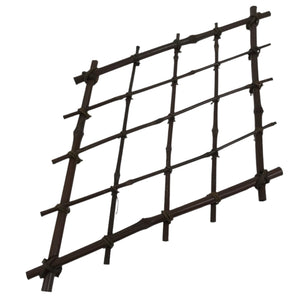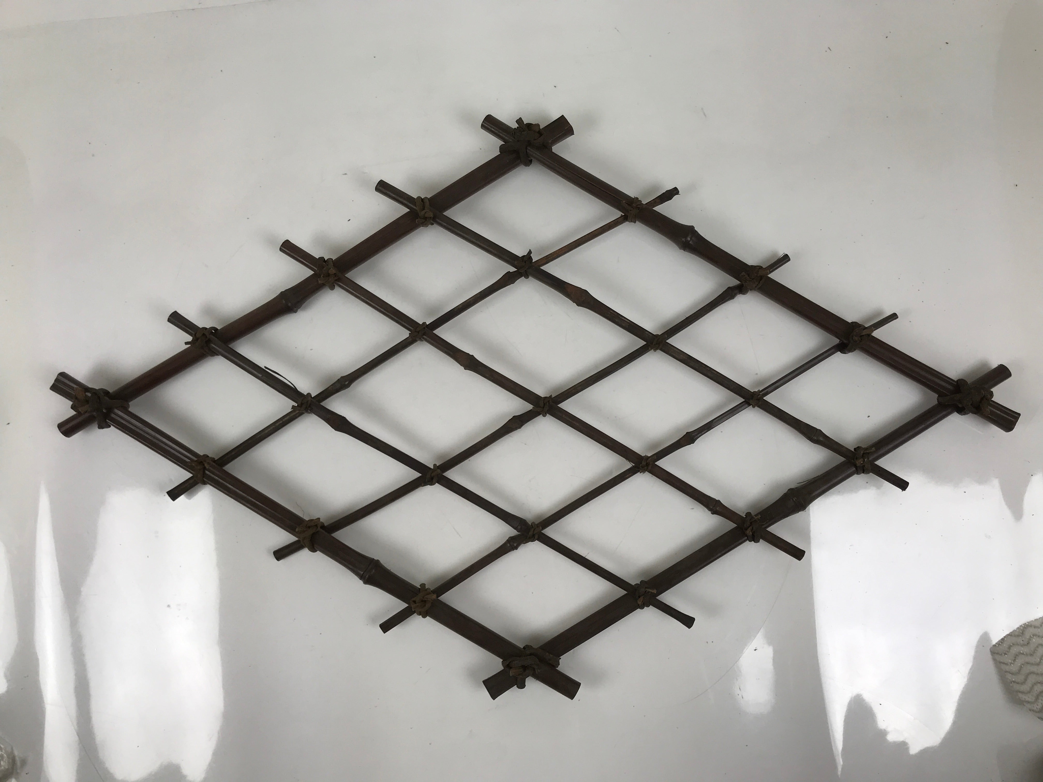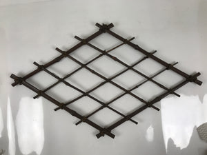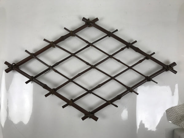 This is a vintage Japanese bamboo lattice wall decoration. The bamboo is stained a dark brown color and each individual part is tied fastened with natural plant vines. You can use it along with a Japanese flower arrangement (kado), a decorative lattice for plants, or as decorative interior decor.
