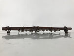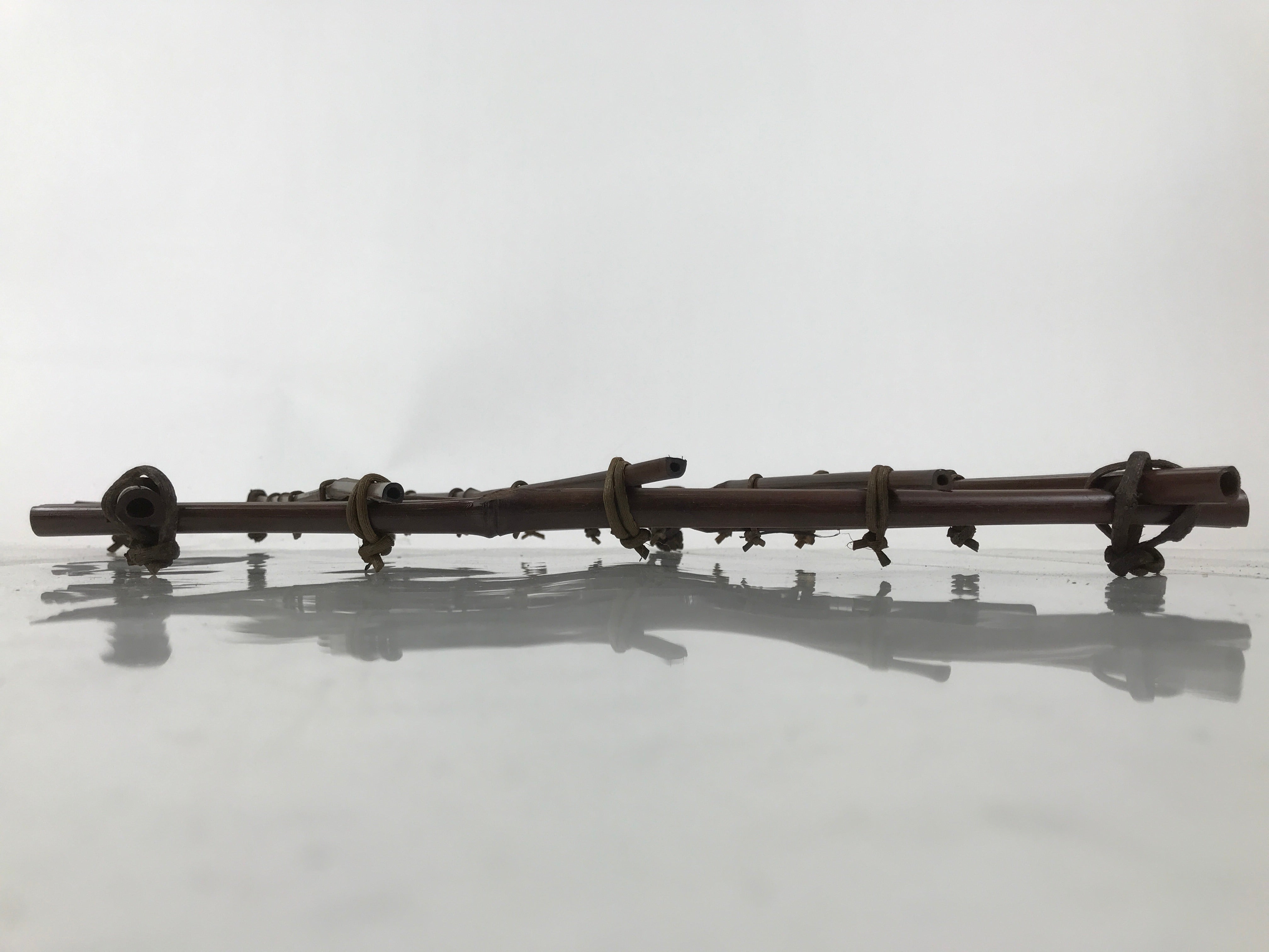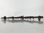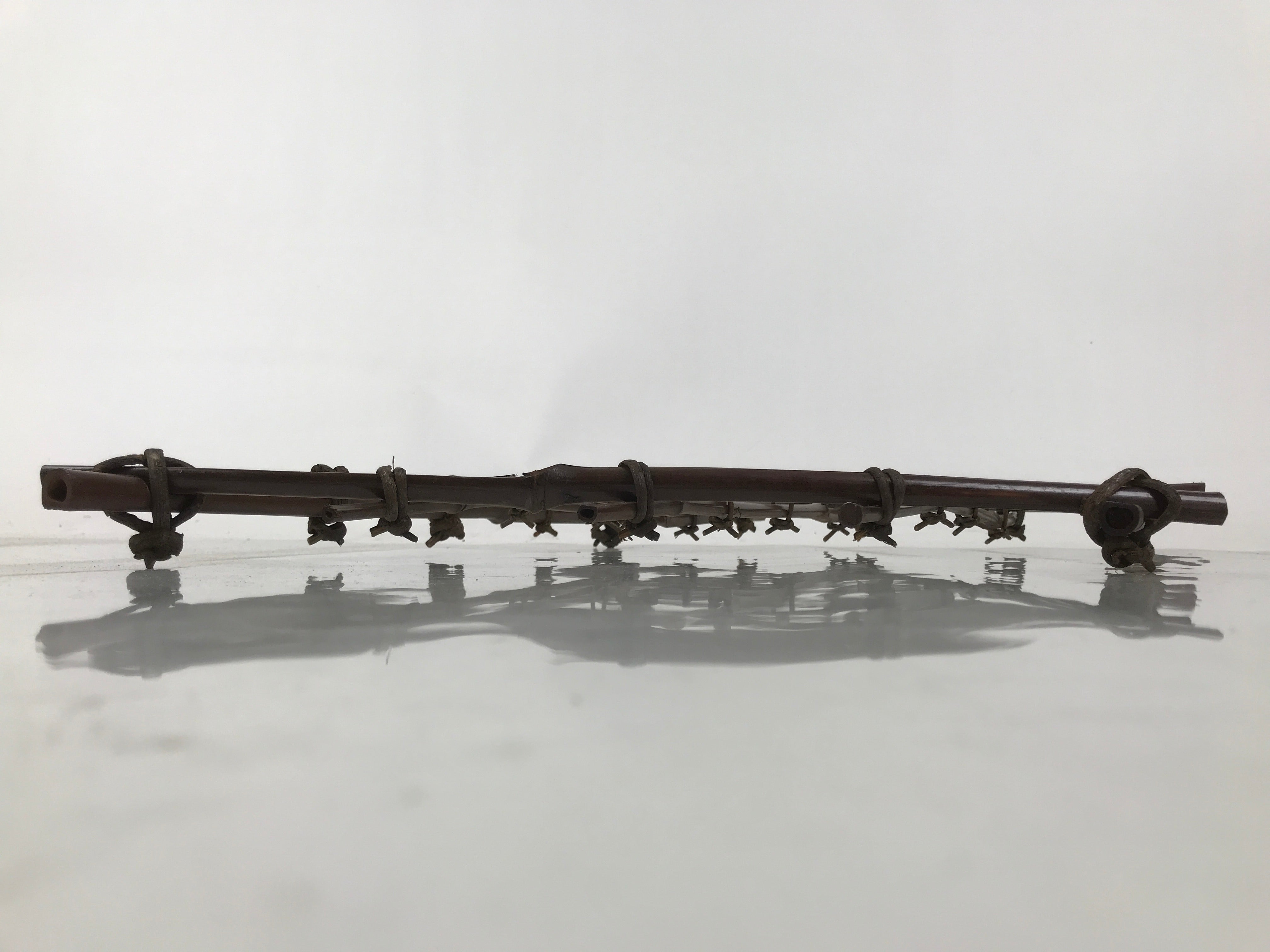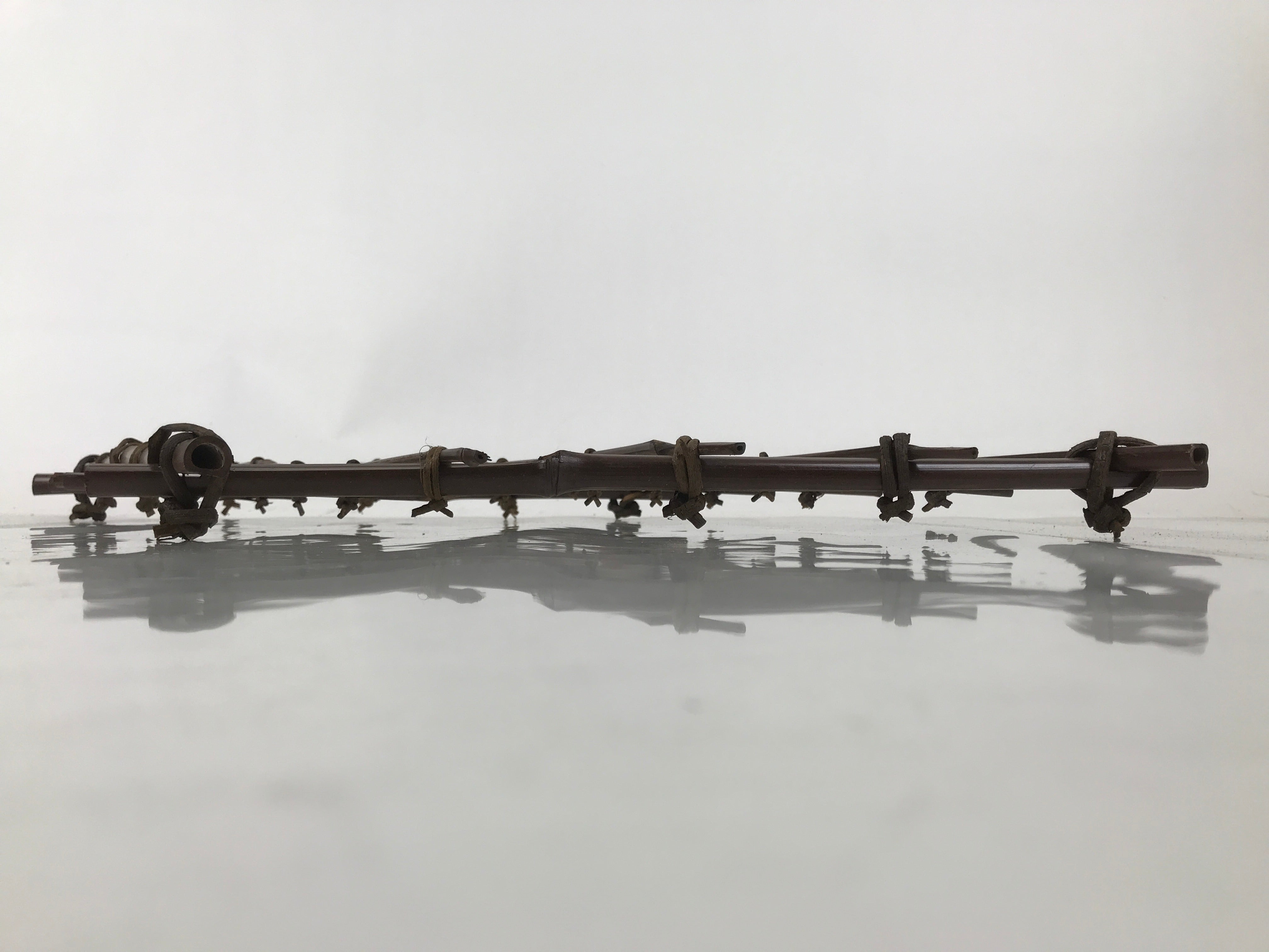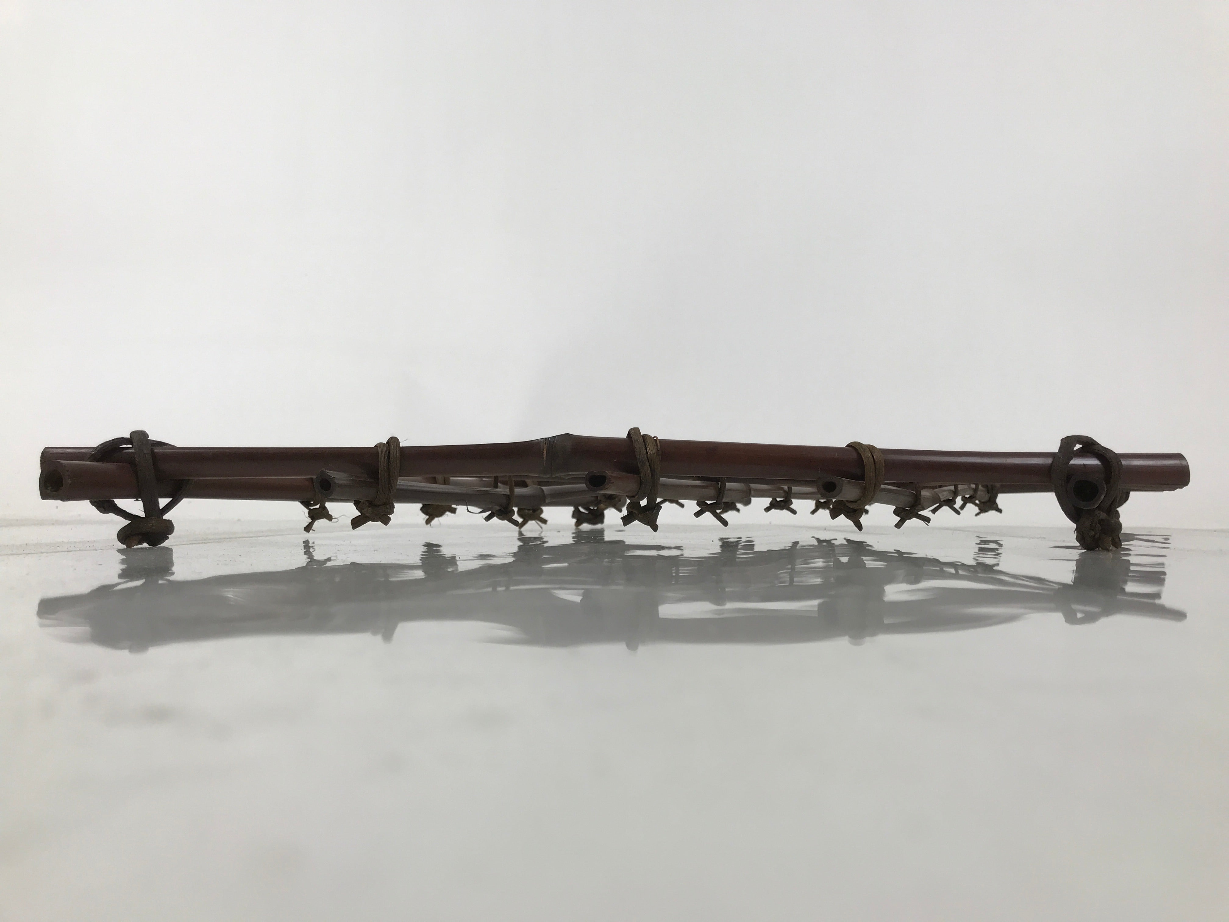 This is a vintage Japanese bamboo lattice wall decoration. The bamboo is stained a dark brown color and each individual part is tied fastened with natural plant vines. You can use it along with a Japanese flower arrangement (kado), a decorative lattice for plants, or as decorative interior decor.