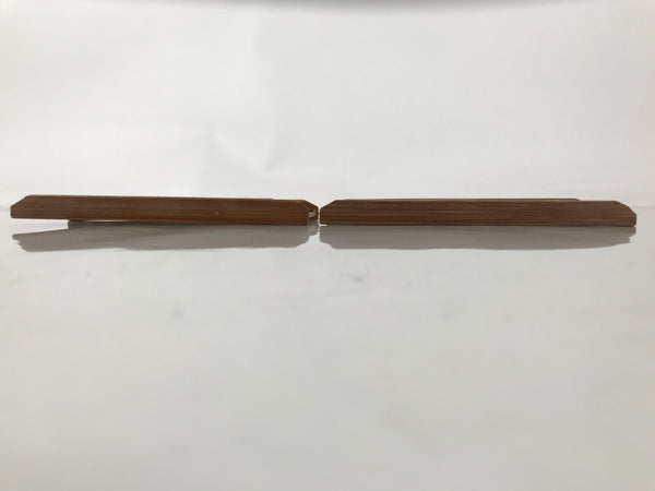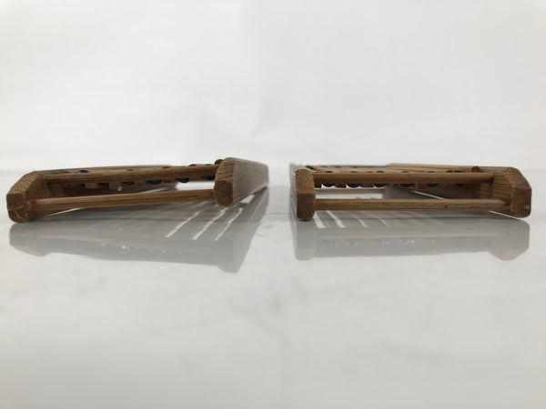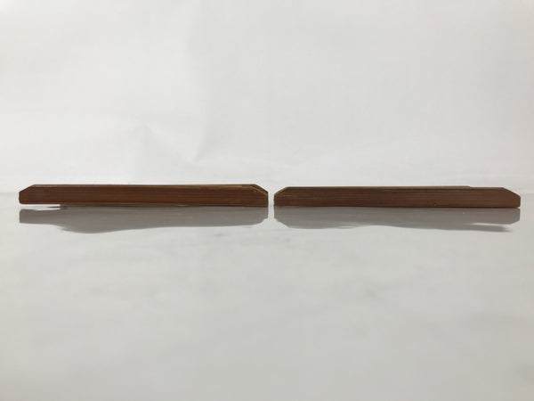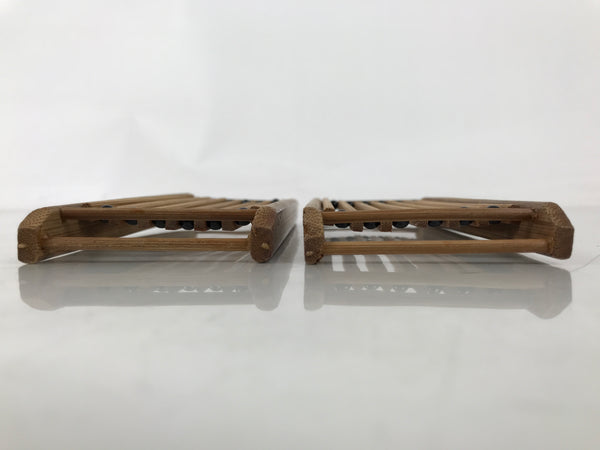 This is a pair of vintage Japanese bamboo wet towel trays called oshibori-oki. The trays are made of bamboo and brushed with translucent lacquer. The design features a slatted board-like bottom with black beads between the sticks. The trays are rectangular and flat with raised sides. These are used to present and hold wet towels for guests during meals.