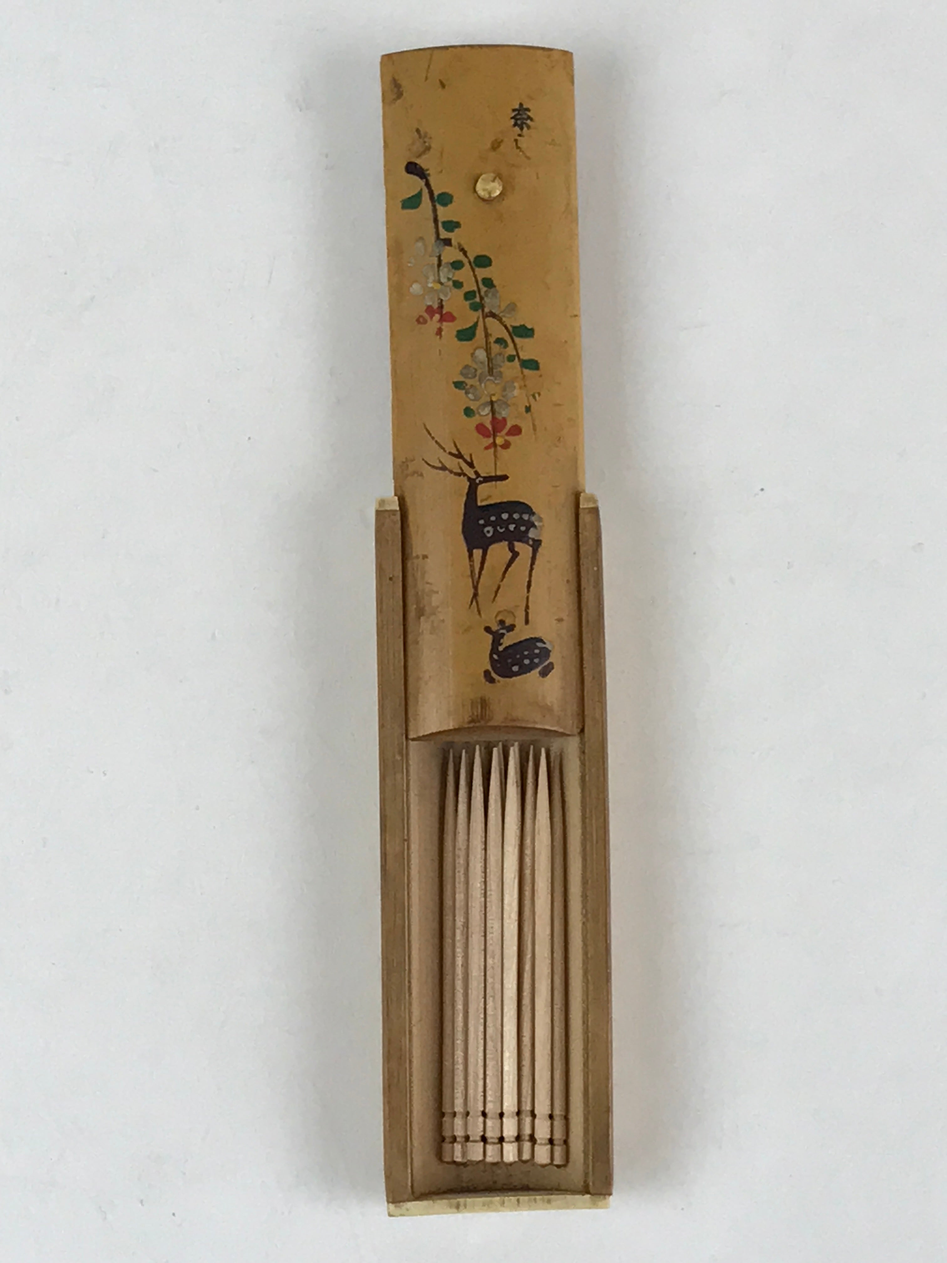 This is a vintage Japanese bamboo product toothpick case. The lid is a sliding type. The lid has a picture of flowers and deer with the word Nara written in kanji.
