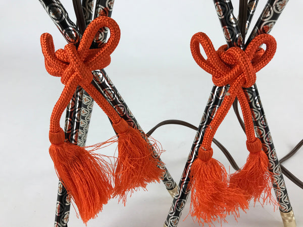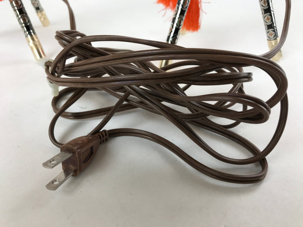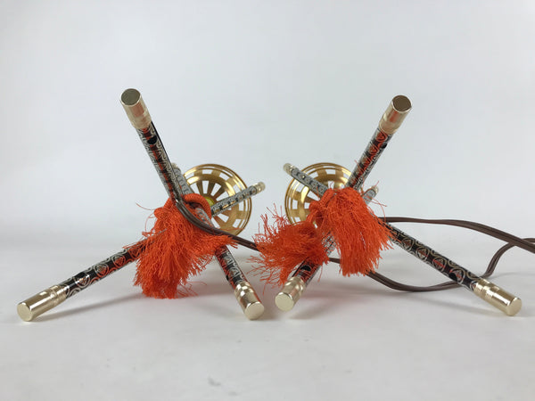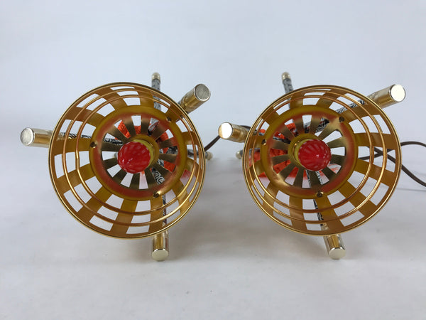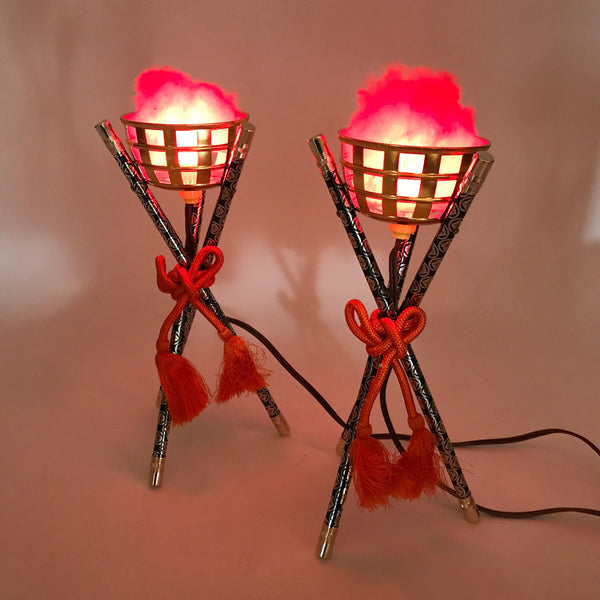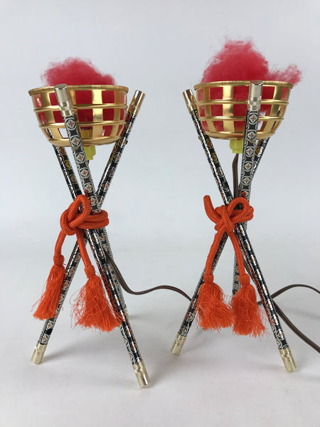 This is a pair of vintage electric Japanese Boys' Day lights, or okagaribi/bonbori. They are used for display and are a symbol of good health and fortune for boys. They can also be used as a hina doll accessory.  The braziers consist of three metal poles with a floral pattern and a gold metal goblet at the top. Each light has a red bulb and red cotton-like fiber puffs to simulate a raging flame. There is a thick orange silk cord tied around each one.