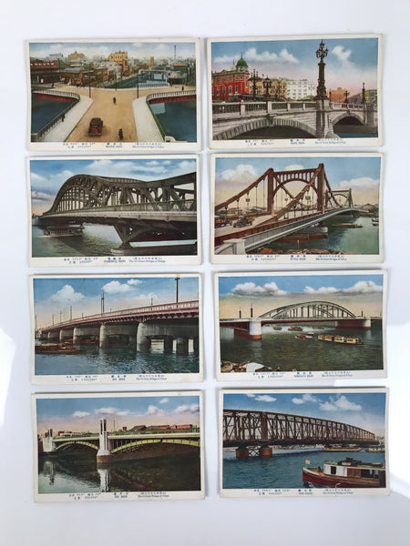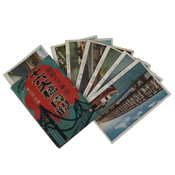 This is a vintage Japanese souvenir postcard set featuring full-color pictures of a selection of famous bridges in Tokyo such as the Edobashi bridge and the Nihonbashi bridge. There is a total of 15 postcards, showing the bridges, the cars, the boats and the buildings of Tokyo at the beginning of the Showa period (C1930). Each postcard has written information: the name of the bridge in Japanese and English, the length and the width of the bridge, and its cost of construction. The cards are stored in a paper envelope with titles in Japanese and English. Please note that even though the title reads "16 bridges of Tokyo" there are only 15 cards.