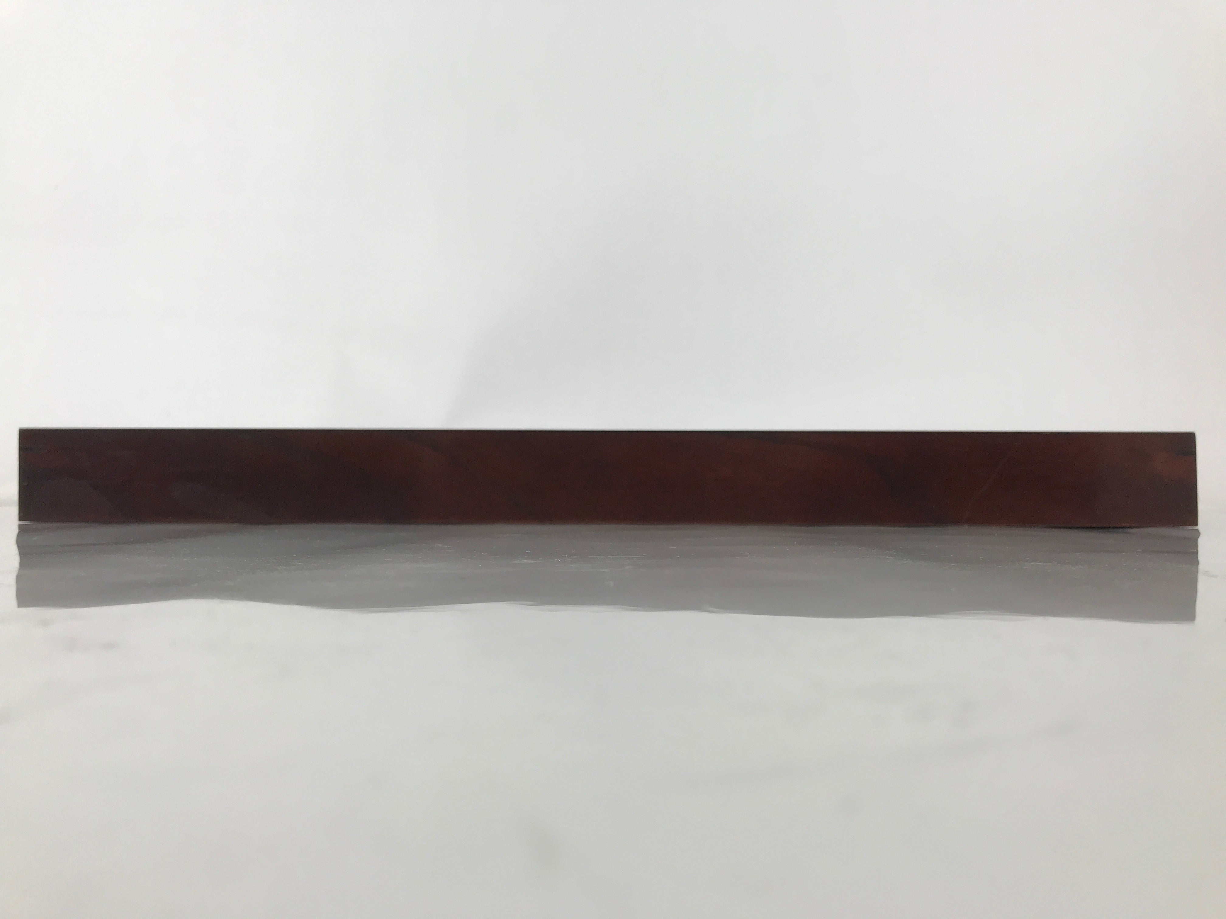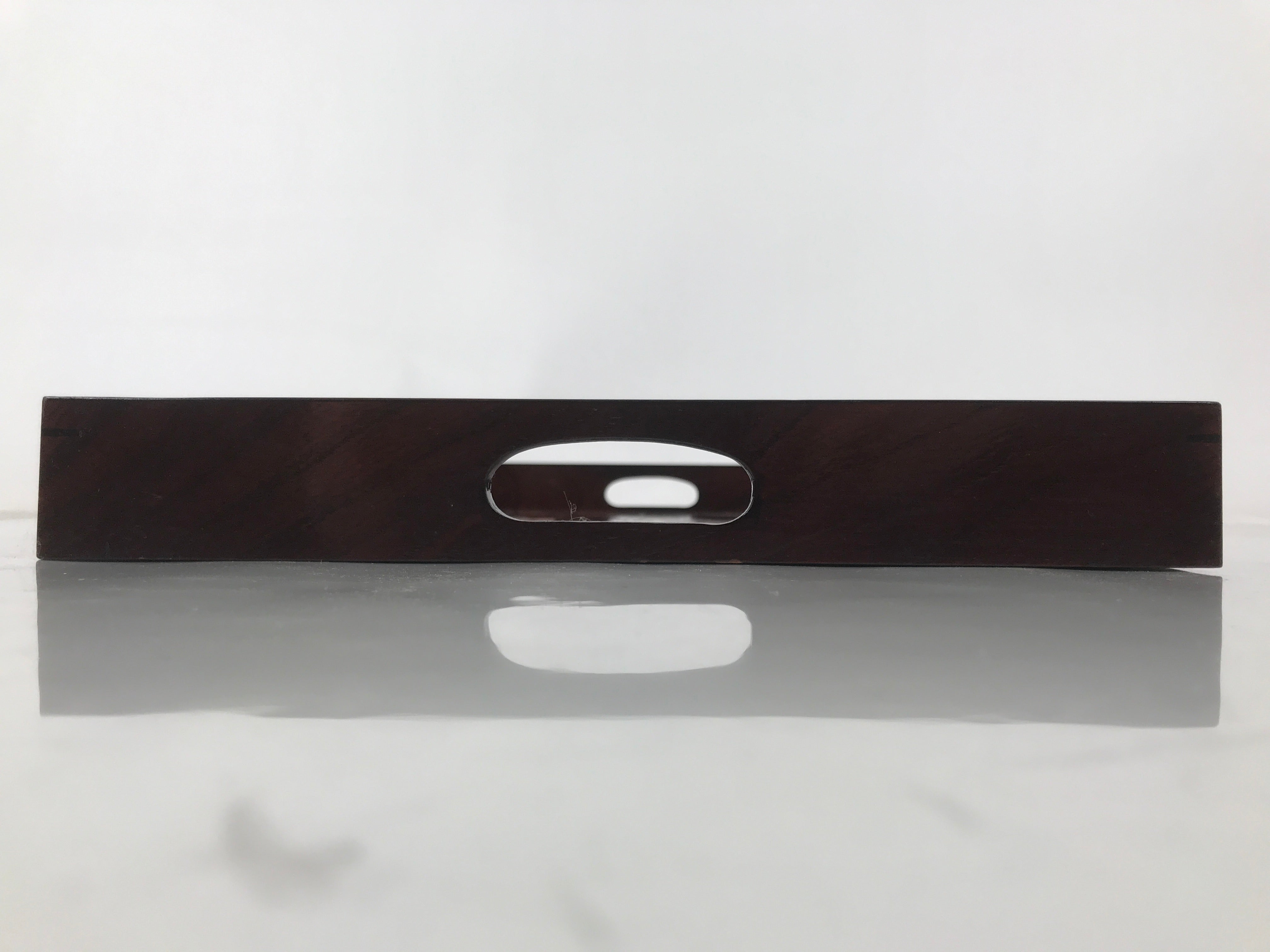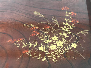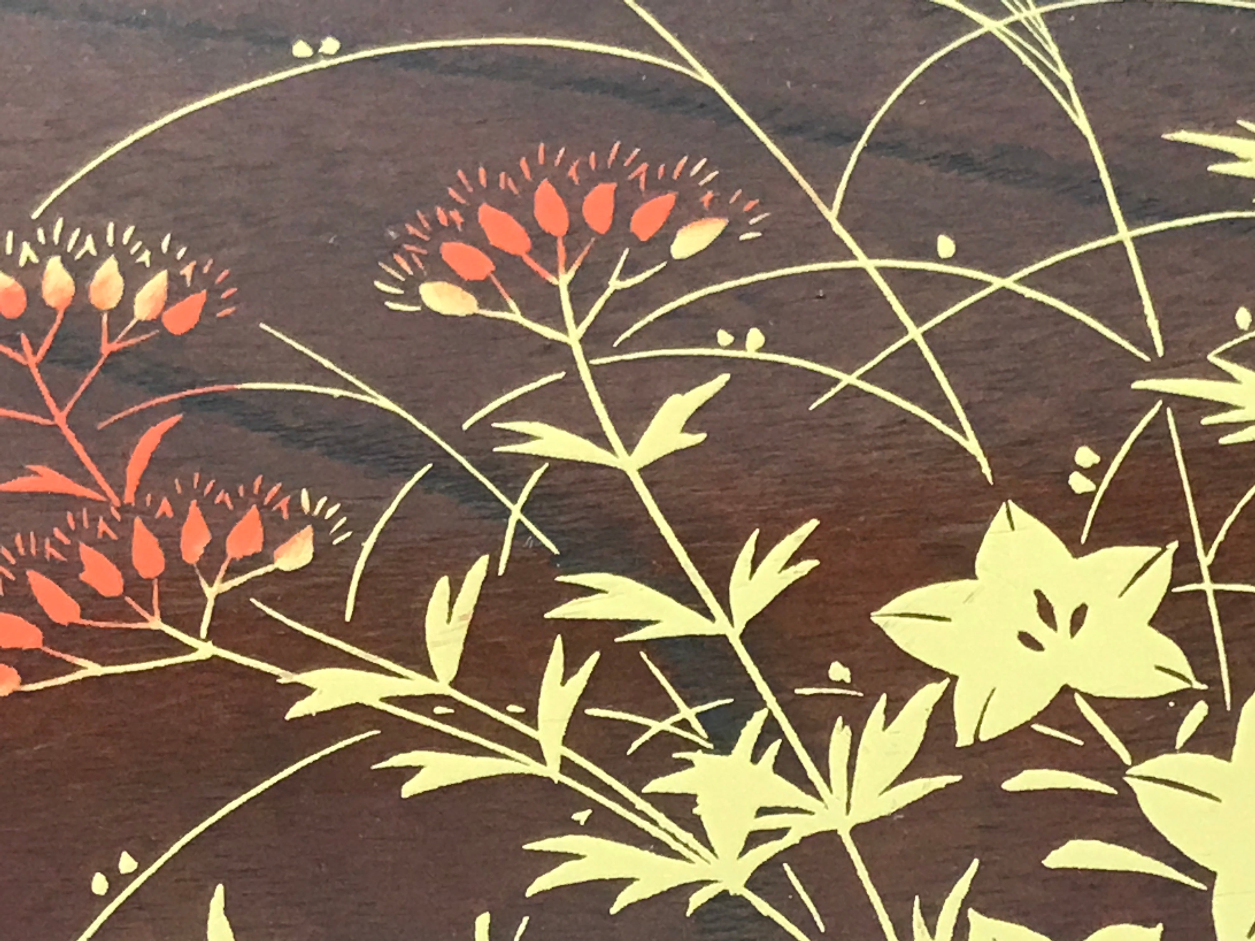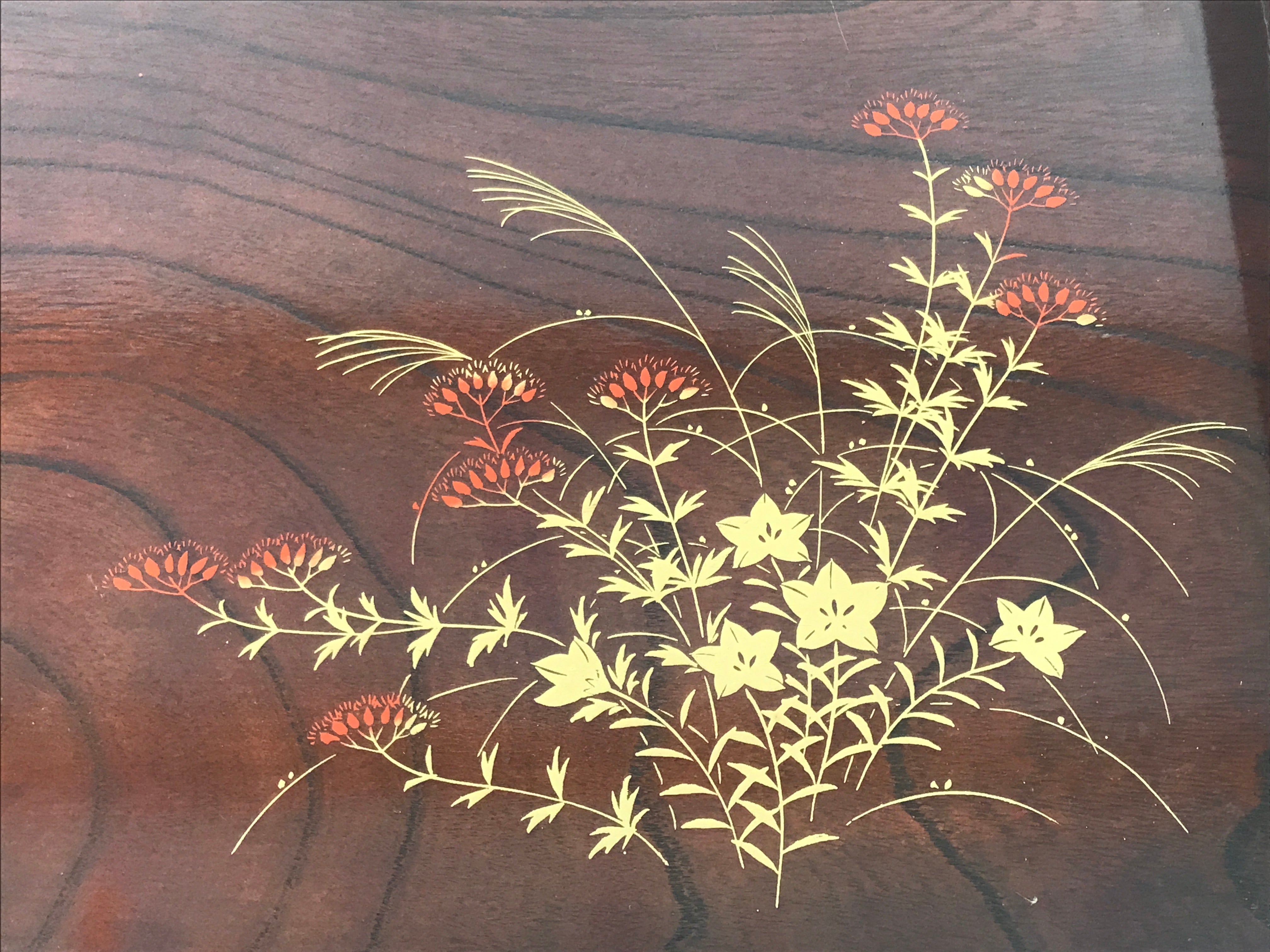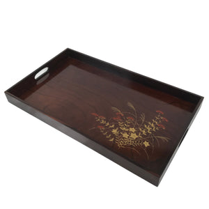 A rich dark brown color with a clear brushed lacquer finish, this simple and sturdy rectangular tray provides both function and beautiful decor. It has some weight to it and prominently features a makie painted image of bellflowers/balloon flowers (kikyo) in gold with other plants.