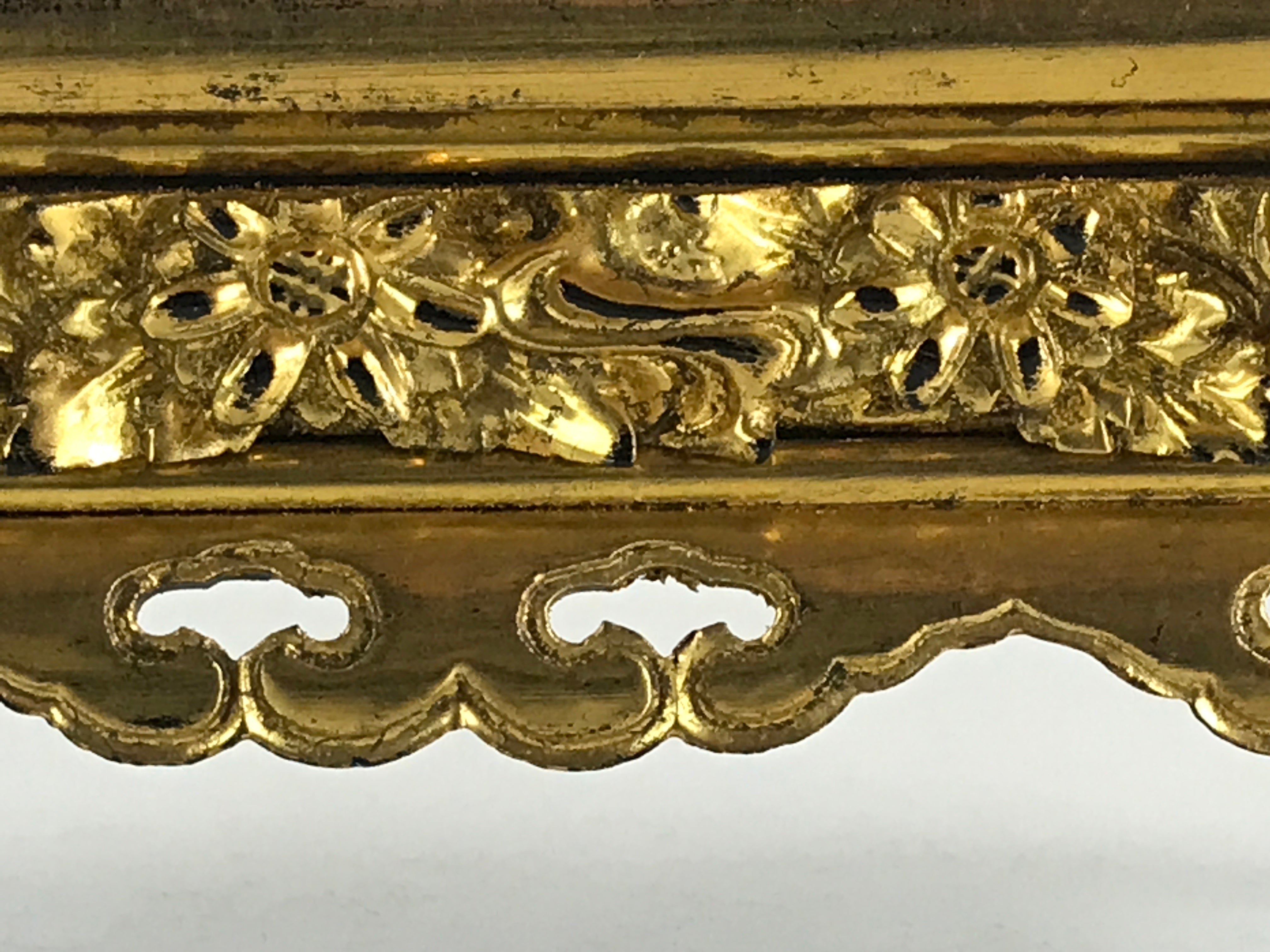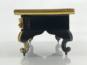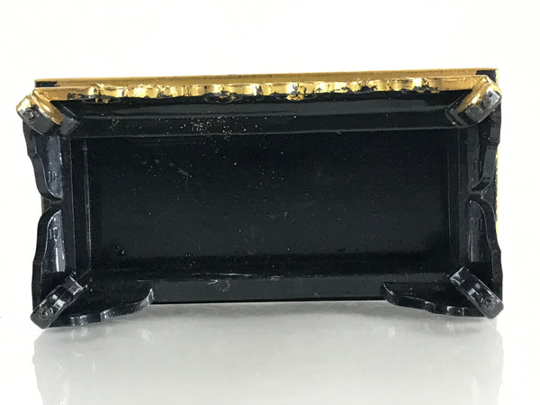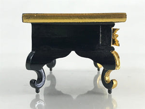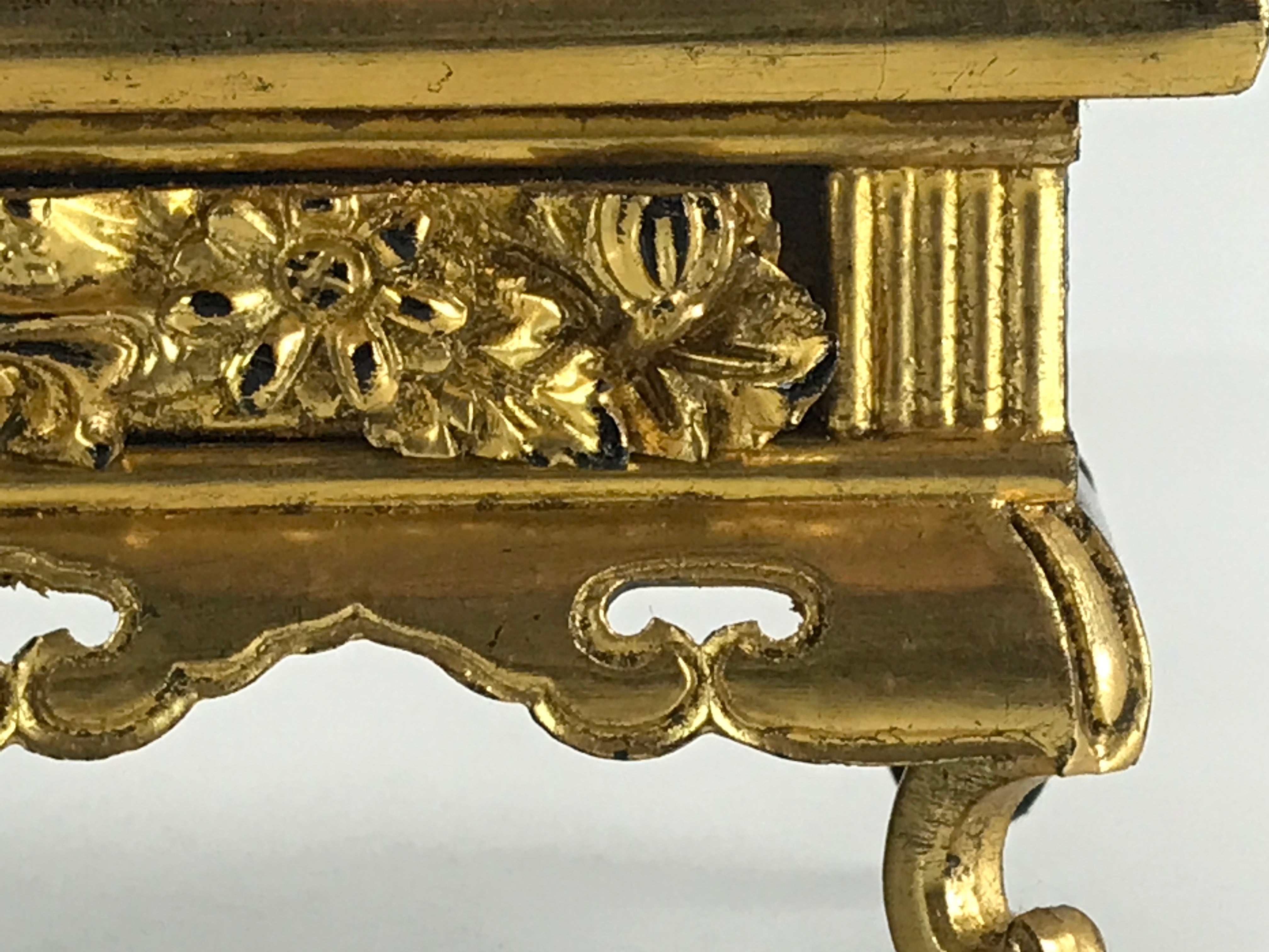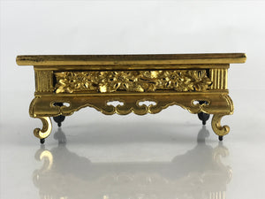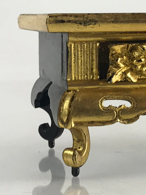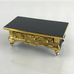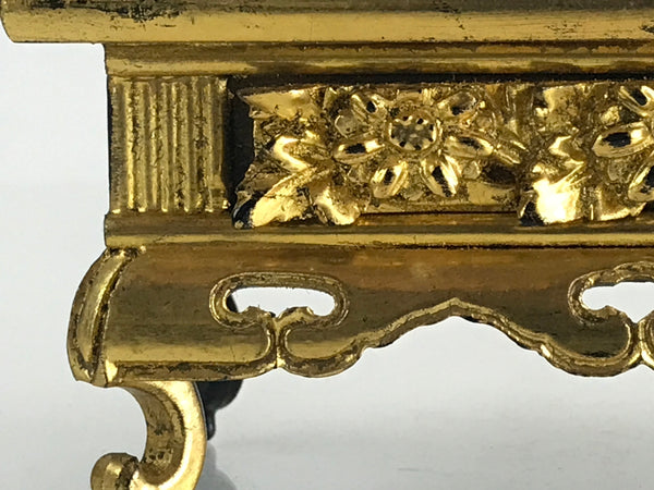 This is a vintage Japanese Buddhist altar fitting a wooden offering table. It is coated with gold and black lacquer. There are two types of offering tables Maejyoku and Uwajyoku. Uwajoku is placed in front of Amidanyorai. This offering table is used for a flower vase, a rice cup, and a kasha incense burner.