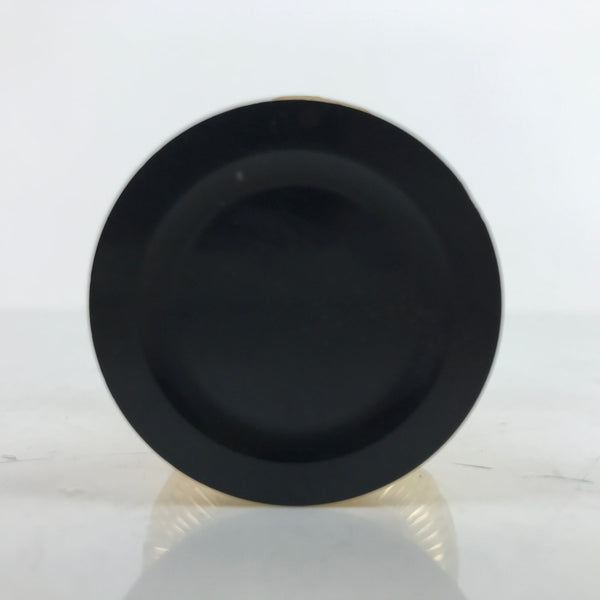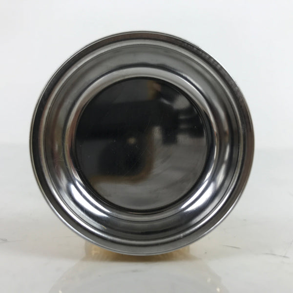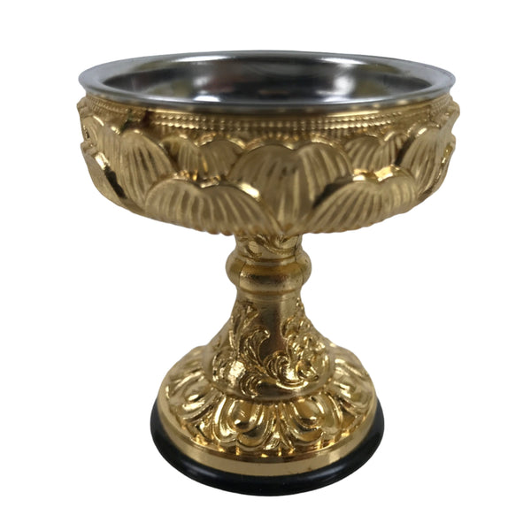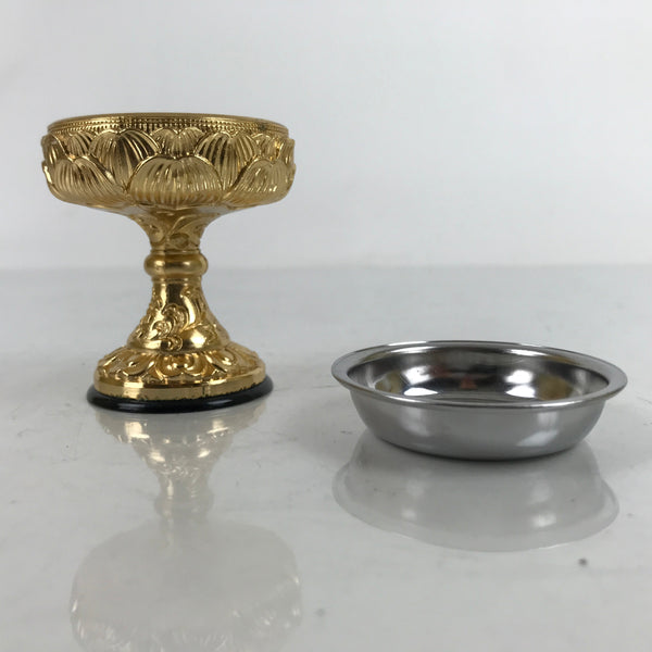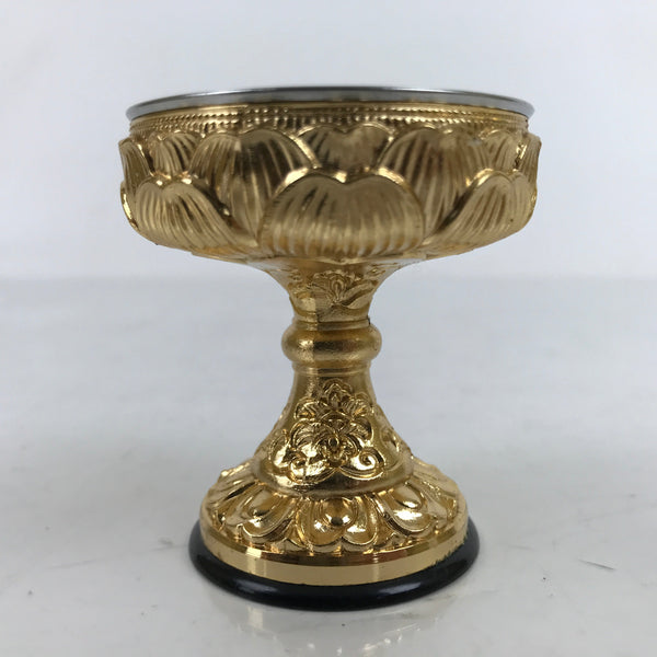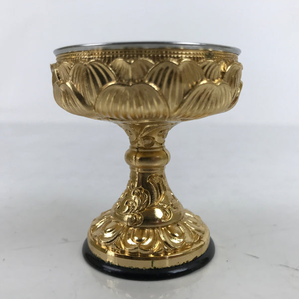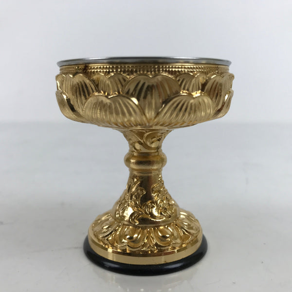 This is a Japanese rice offering cup, Buppanki, made for use in a Buddhist altar. This cup is small and made of gold-colored metal with a lotus flower design. There is a black plastic base that protects surfaces from scratching. It has a plain metal removable insert. It has a plain metal removable insert. The rice offered to Buddhist altars is called “Buppan”. Other things such as sake, mochi, etc are also offered at home and temple altars in this style of cup.