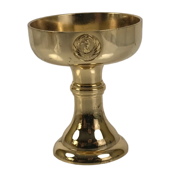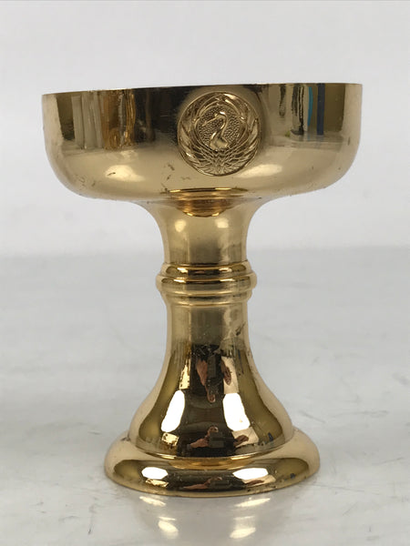This is a Japanese rice offering cup, Buppanki, made for use in a Buddhist altar. This cup is simple, small, and made of brass. The rice offered to Buddhist altars is called “Buppan”. In the Jodo Shinshu Otani sect, we use the term "Obuku". This cup has a crane on the front which is commonly associated with the Nichiren Shoshu sect of Buddhism.