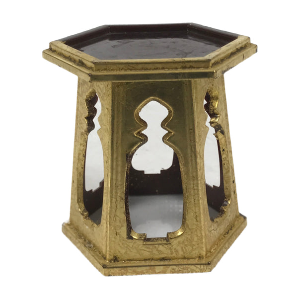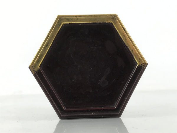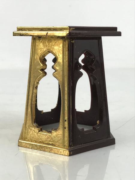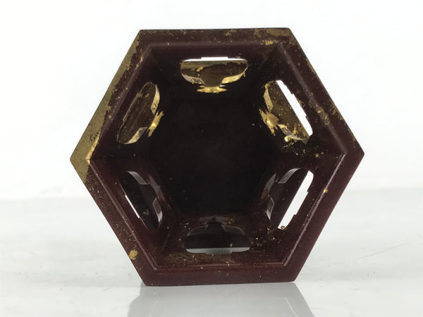 This is a Japanese offering cup stands for a Buddhist altar. Also called bukki, this important altar accessory is made of brown resin with a painted gold front side in a simple hexagonal shape. It is used often in pairs to hold small cups of rice, sake, and acts as an offering to Buddha and one's ancestors.