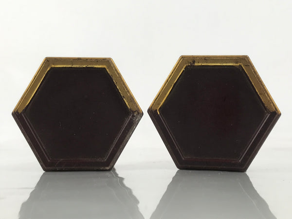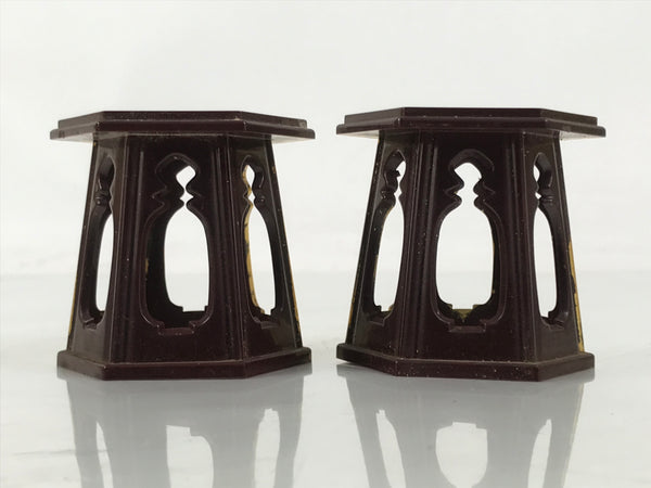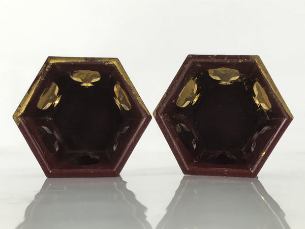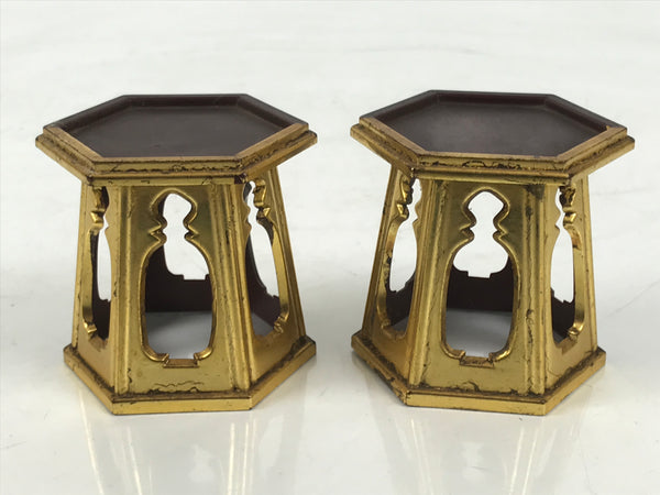 This is a pair of Japanese offering cup stands for a Buddhist altar. Also called bukki, this important altar accessory is made of reddish-brown resin and painted with gold.  It has a simple hexagonal shape. It is used often in pairs to hold small cups of rice, sake, and more as an offering to Buddha and one's ancestors.