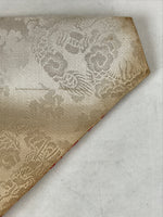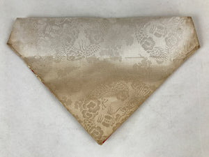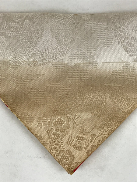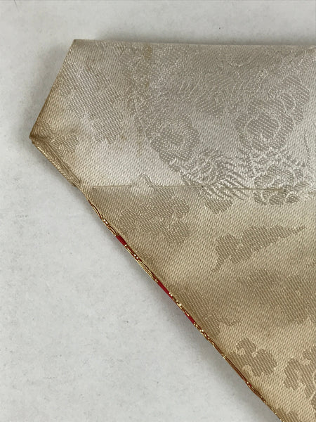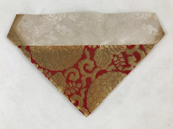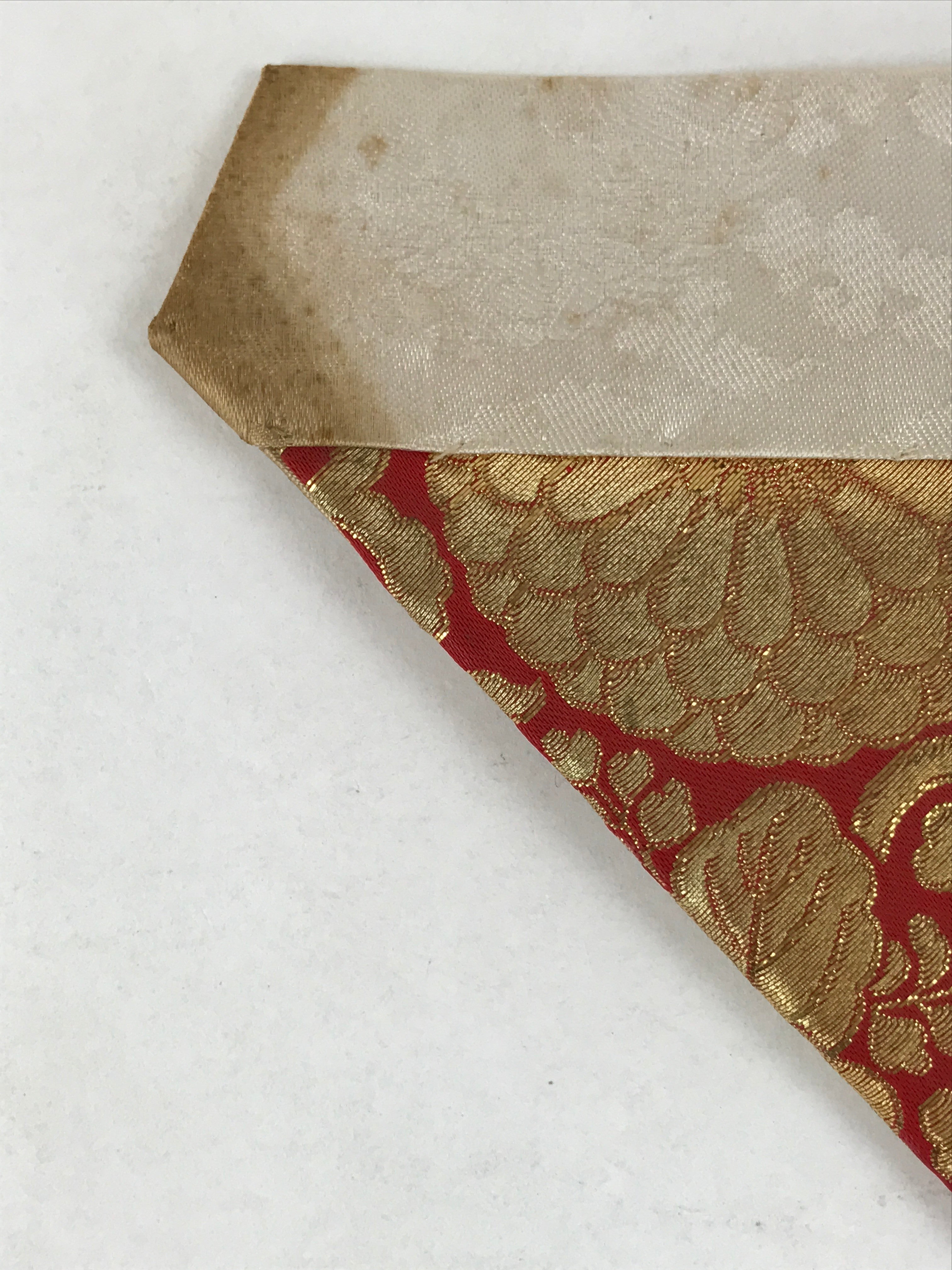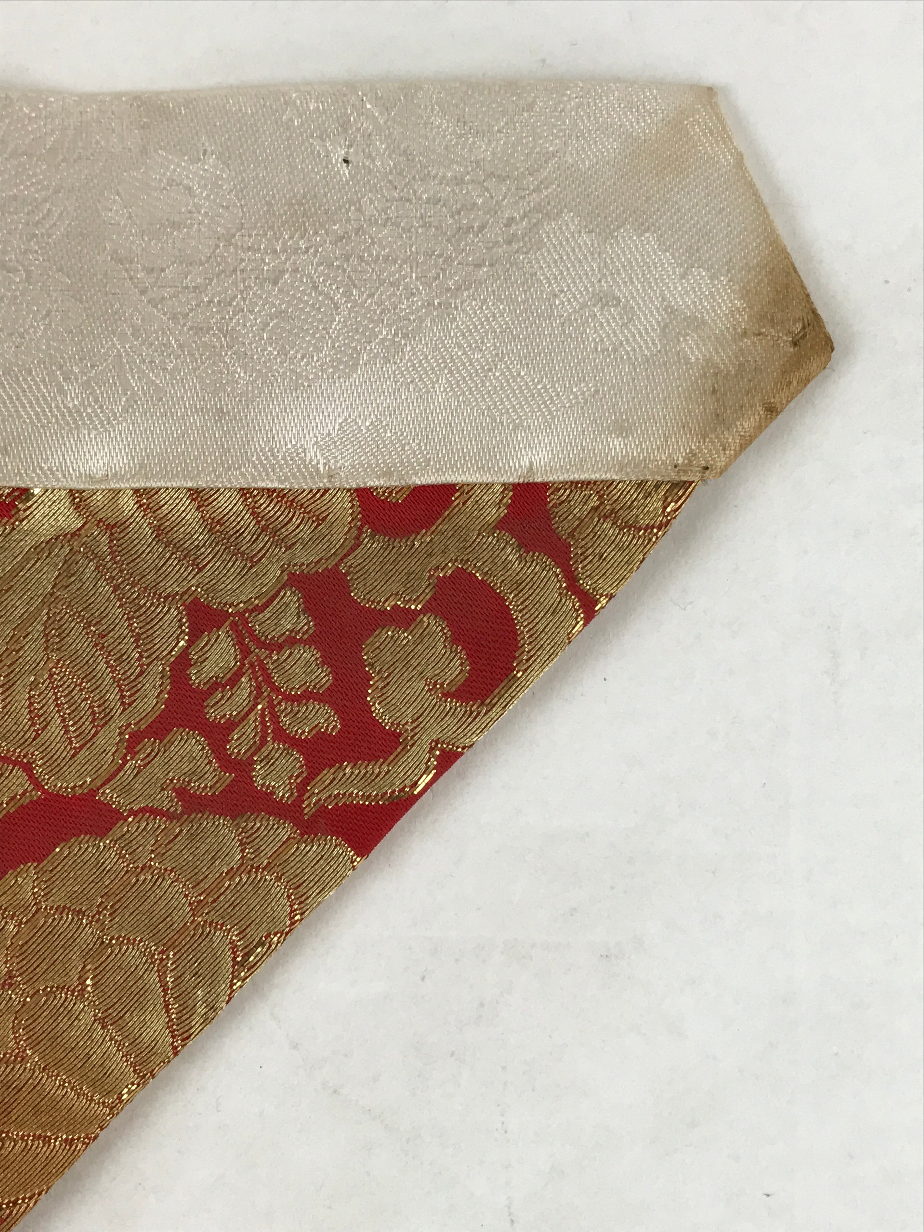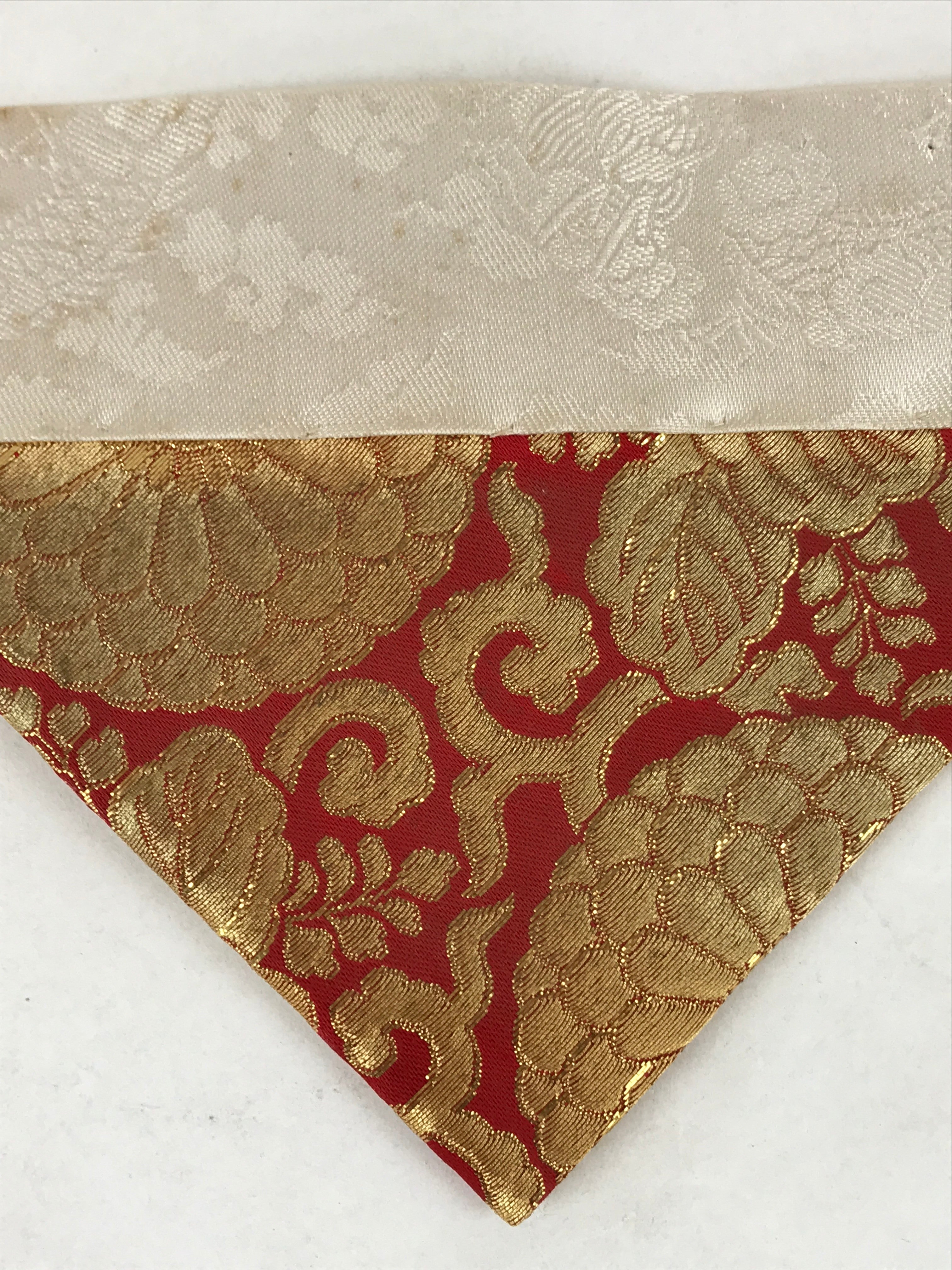 This is a vintage Japanese Buddhist altar tablecloth, or uchishiki. Made of silk and other woven fabric, the backside is white with a floral pattern while the front is red with embroidered gold flowers such as chrysanthemums.