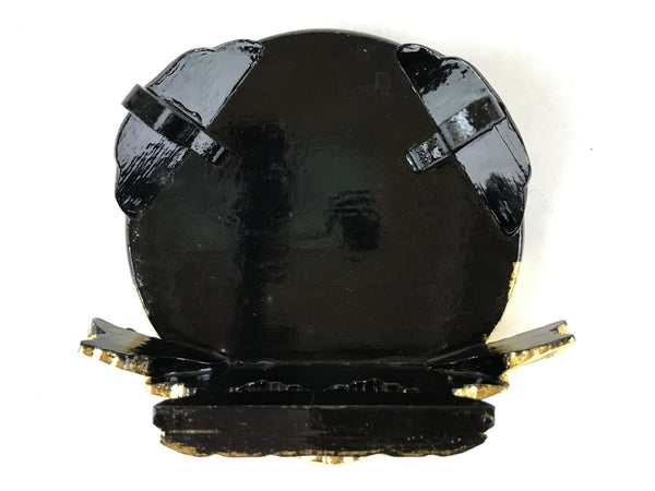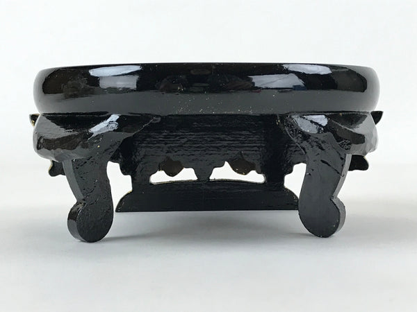 This is a Japanese statue stand for a Buddhist altar. Made for displaying important statues (such as amida nyorai) or for use with offerings, this important altar accessory has a large black lacquered base with brushed gold on the front-facing designs. It has a hand-carved design of chrysanthemums. It stands on three sturdy legs.