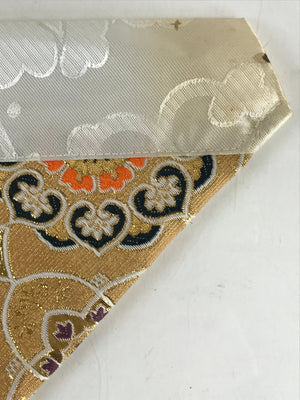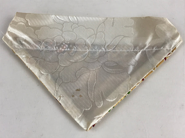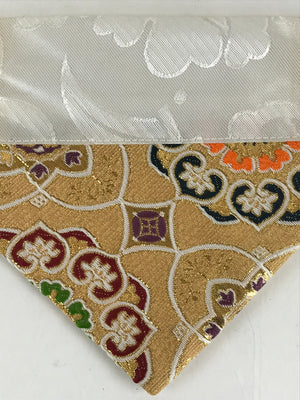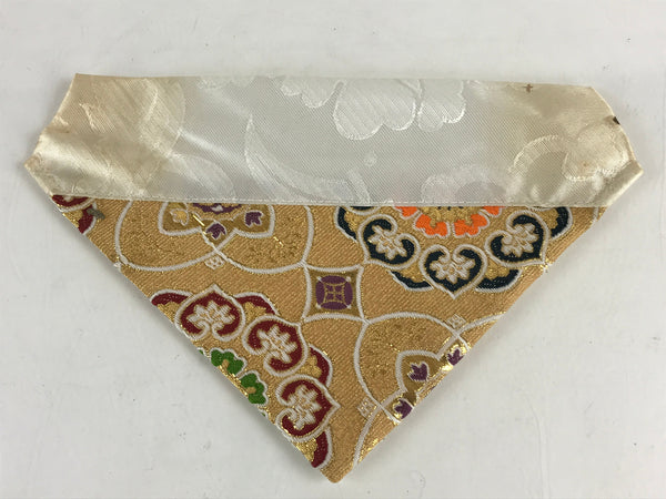 This is a vintage Japanese Buddhist altar tablecloth Uchishiki. This is gold floral embroidery. Triangular uchishiki is mainly used by followers of Jodo Shinshu Buddhism as the upper table (Maejyoku) and the front table (Uwajyoku) in the Buddhist altar during events such as New Year's Day, the equinoctial week, Obon, and memorial services.