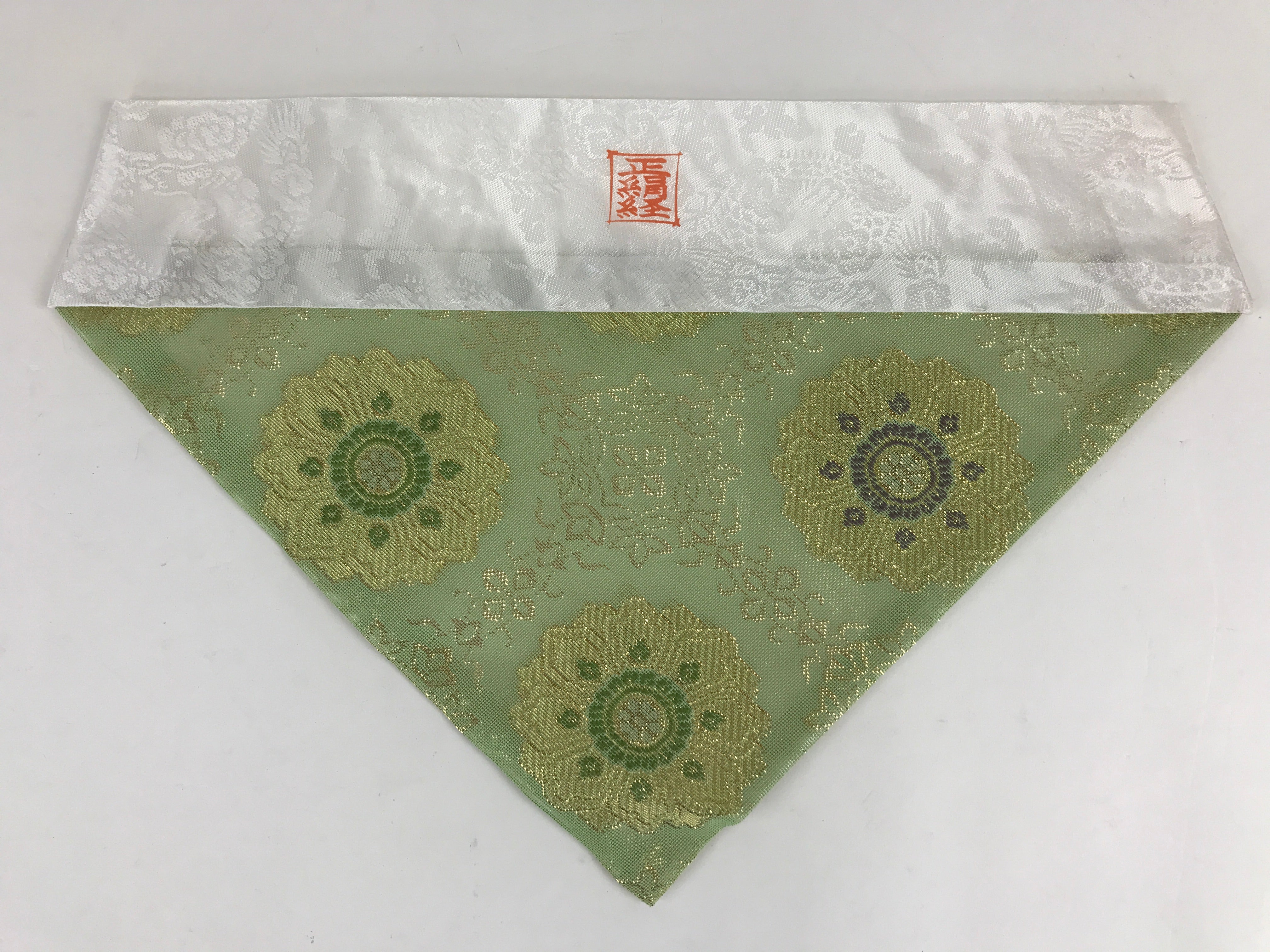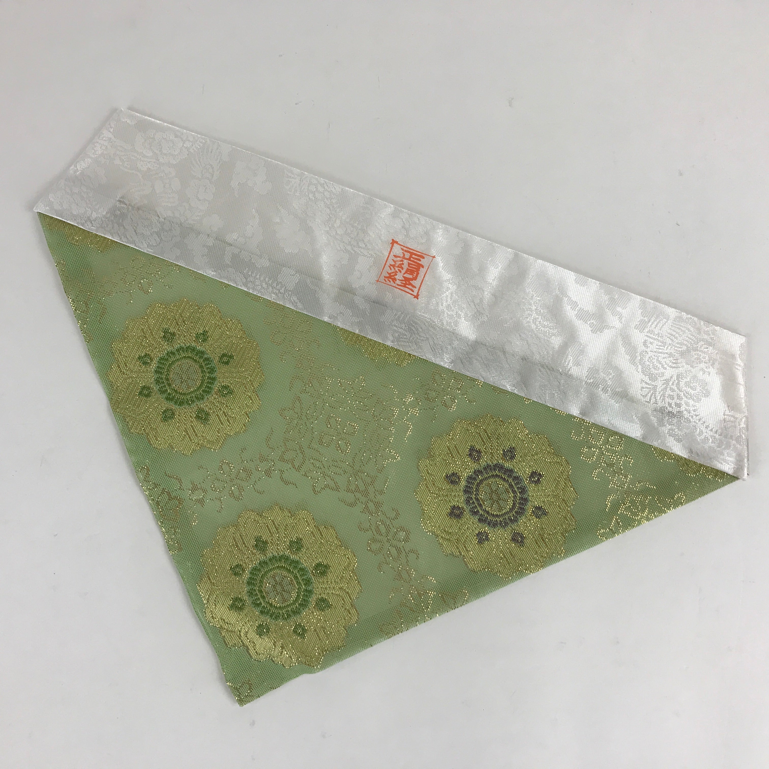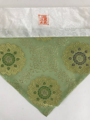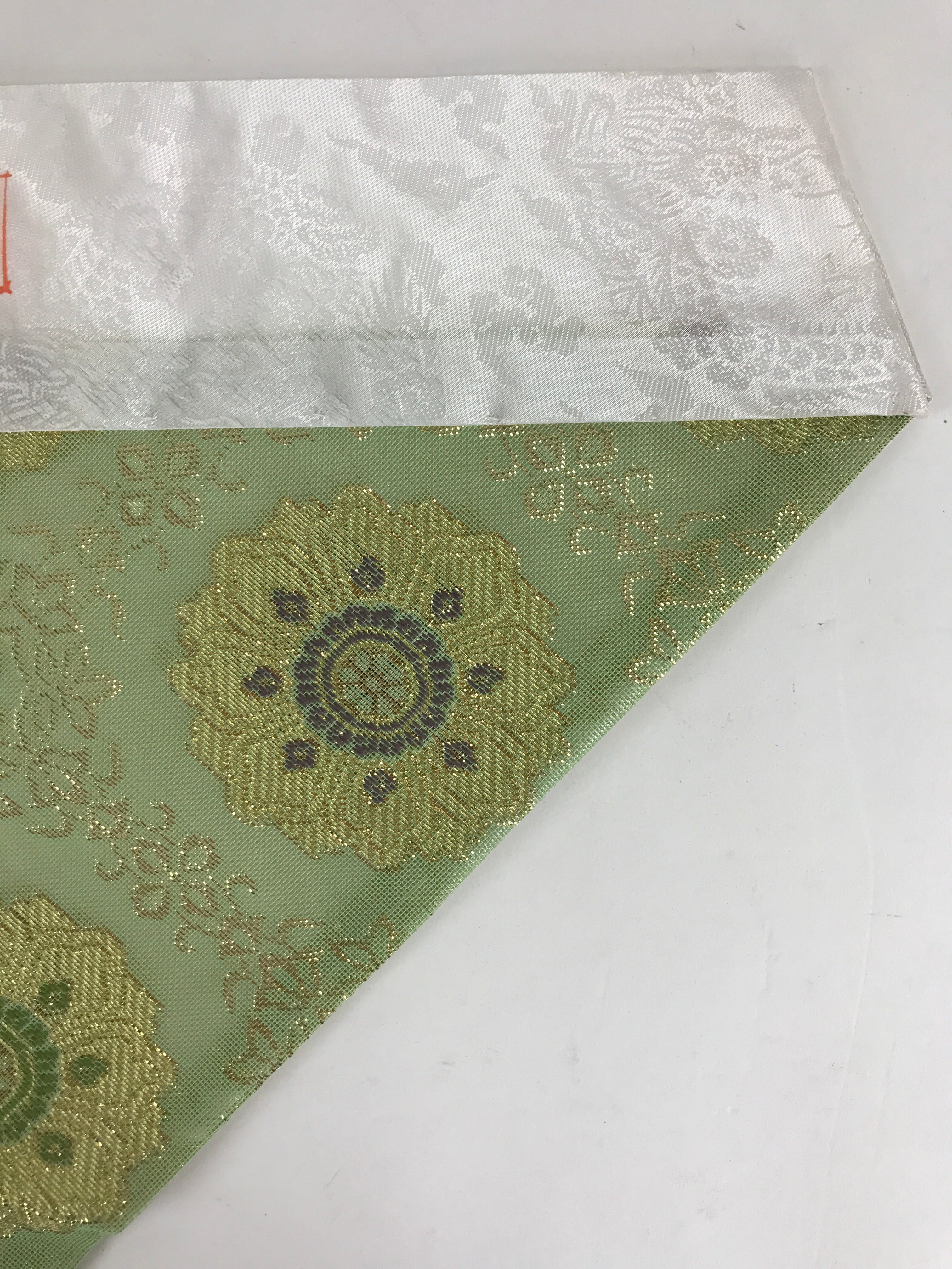 This is a vintage Japanese Buddhist altar tablecloth Uchishiki. It is light green openwork fabric for summer, embroidered with gold floral patterns. It has a kanji stamp that says "Silk". Triangular uchishiki is mainly used by followers of Jodo Shinshu Buddhism as the upper table (Maejyoku) and the front table (Uwajyoku) in the Buddhist altar during events such as New Year's Day, the equinoctial week, Obon, and memorial services.
